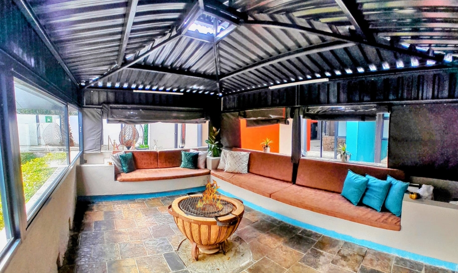 A cozy, roofed lounge centered around a fire pit, ideal for intimate gatherings and relaxed evenings.