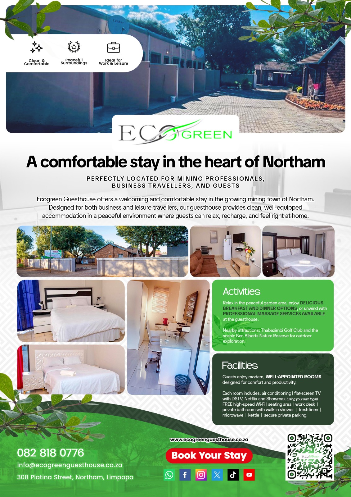 Ecogreen Guest House is ideally positioned close to major mining operations, making it a convenient accommodation choice for contractors and professionals working in the region. We are located within 15 minutes of Tumela Mine, Swartklip Mine, Northam Platinum Mine, and Dishaba Mine, ensuring easy access for work-related stays.