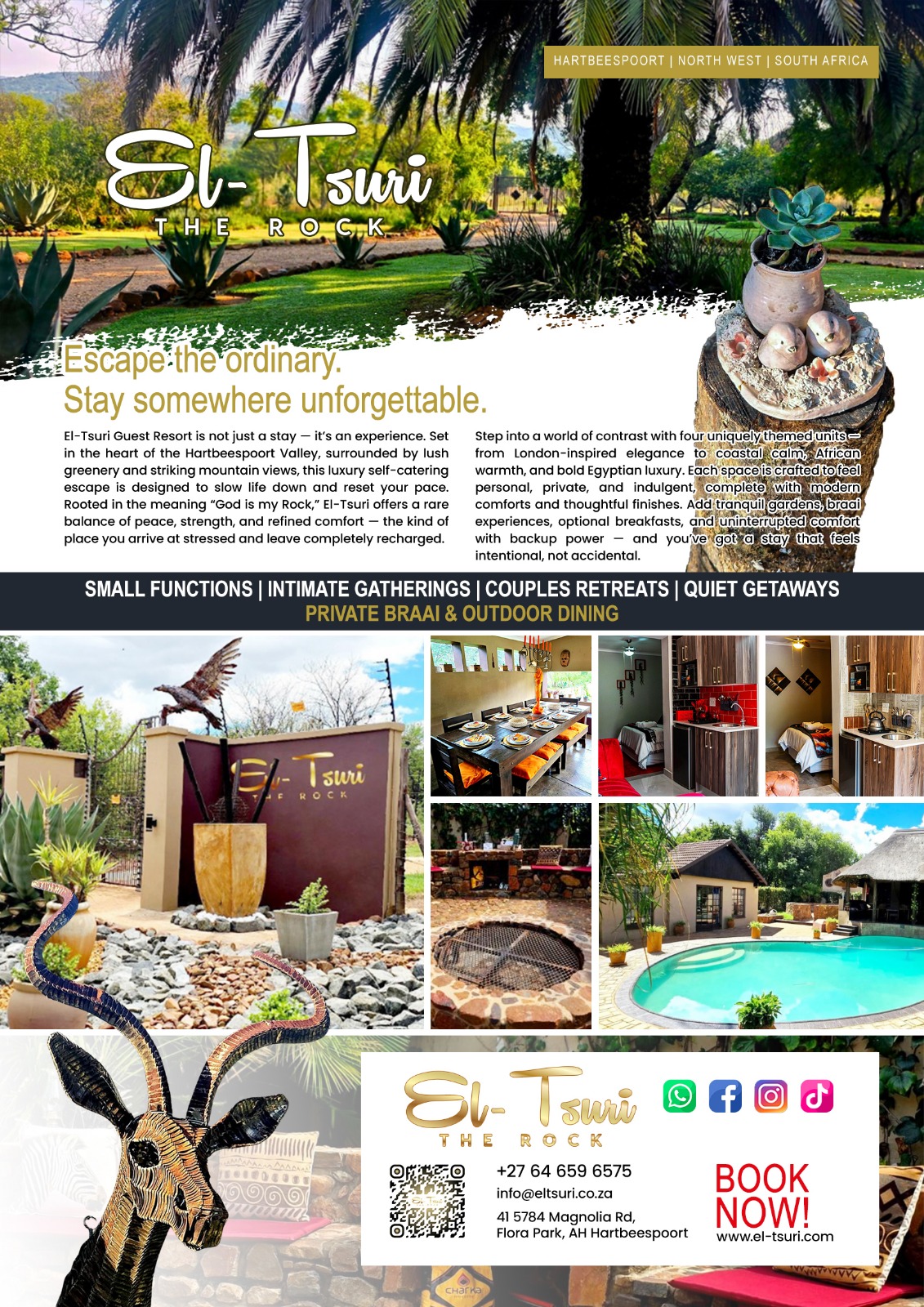 Welcome to El-Tsuri Guest Resort, a peaceful retreat nestled in the heart of the scenic Hartbeespoort Valley.