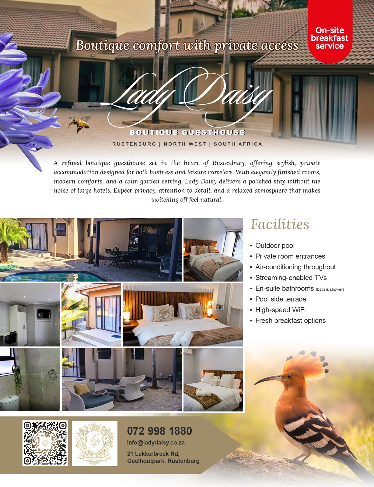 Whether it’s lounging on our patio, enjoying the pool, or simply relaxing in your elegantly appointed room, Lady Daisy Boutique Guesthouse offers the perfect setting for a memorable Rustenburg getaway.