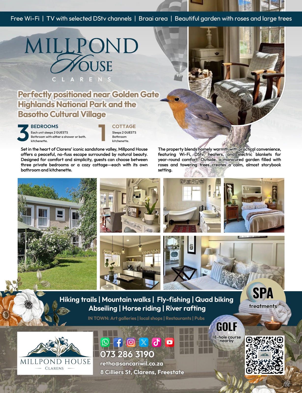 It is located near Golden Gate Highlands National Park and the Basotho Cultural Village, each with its own unique charm.