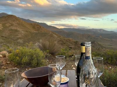 Nestled in an amphitheatre of cliffs, this cabin offers spectacular vistas of the Western Klein Karoo flora and surrounding mountains. Enjoy rustic comfort with outdoor showers, a well-equipped kitchenette , and a serene deck — ideal for romantic getaways or family retreats.