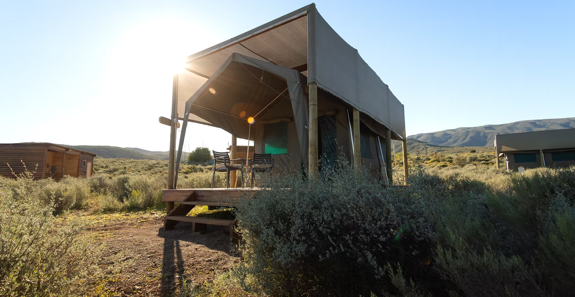 Our four safari tents provide a glamping experience with limited solar electricity, free WiFi, and communal kitchen and ablution facilities. Experience the beauty of the Klein Karoo while still enjoying comfort and convenience.