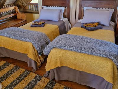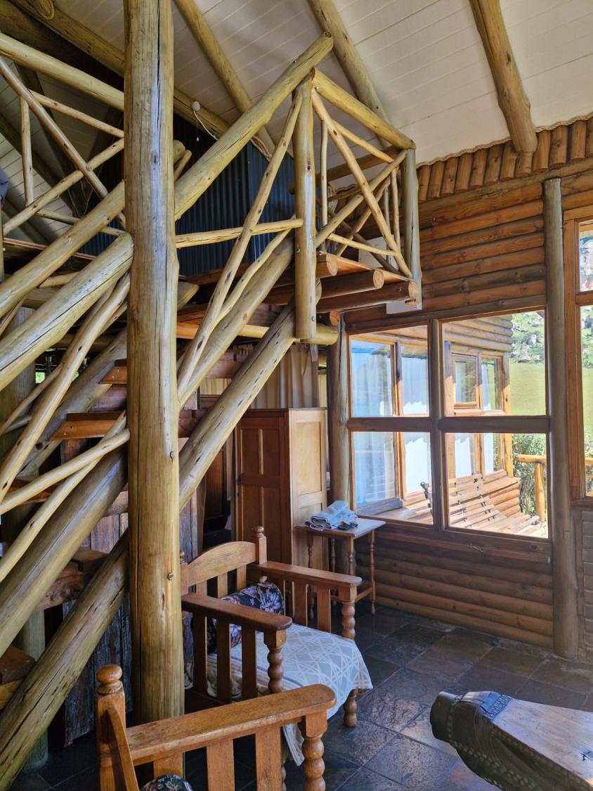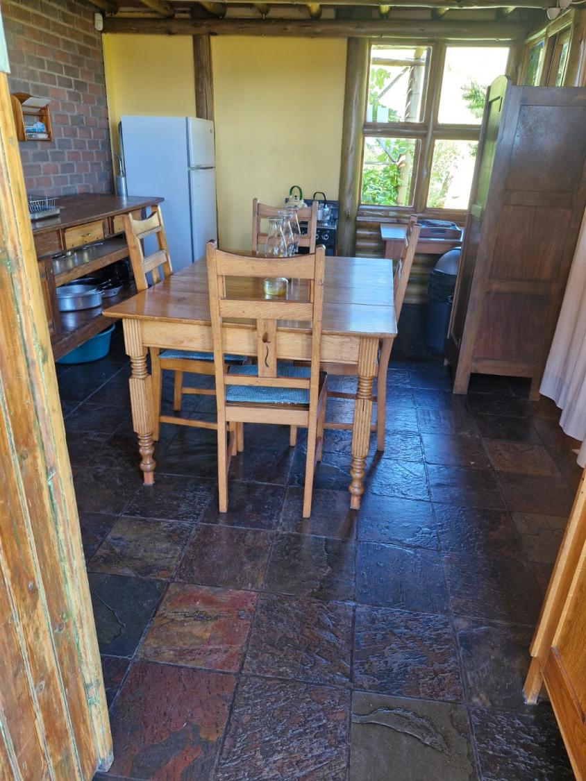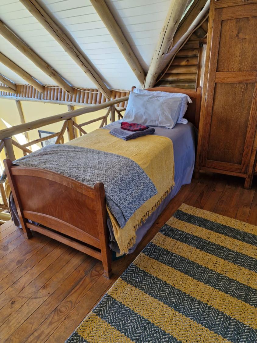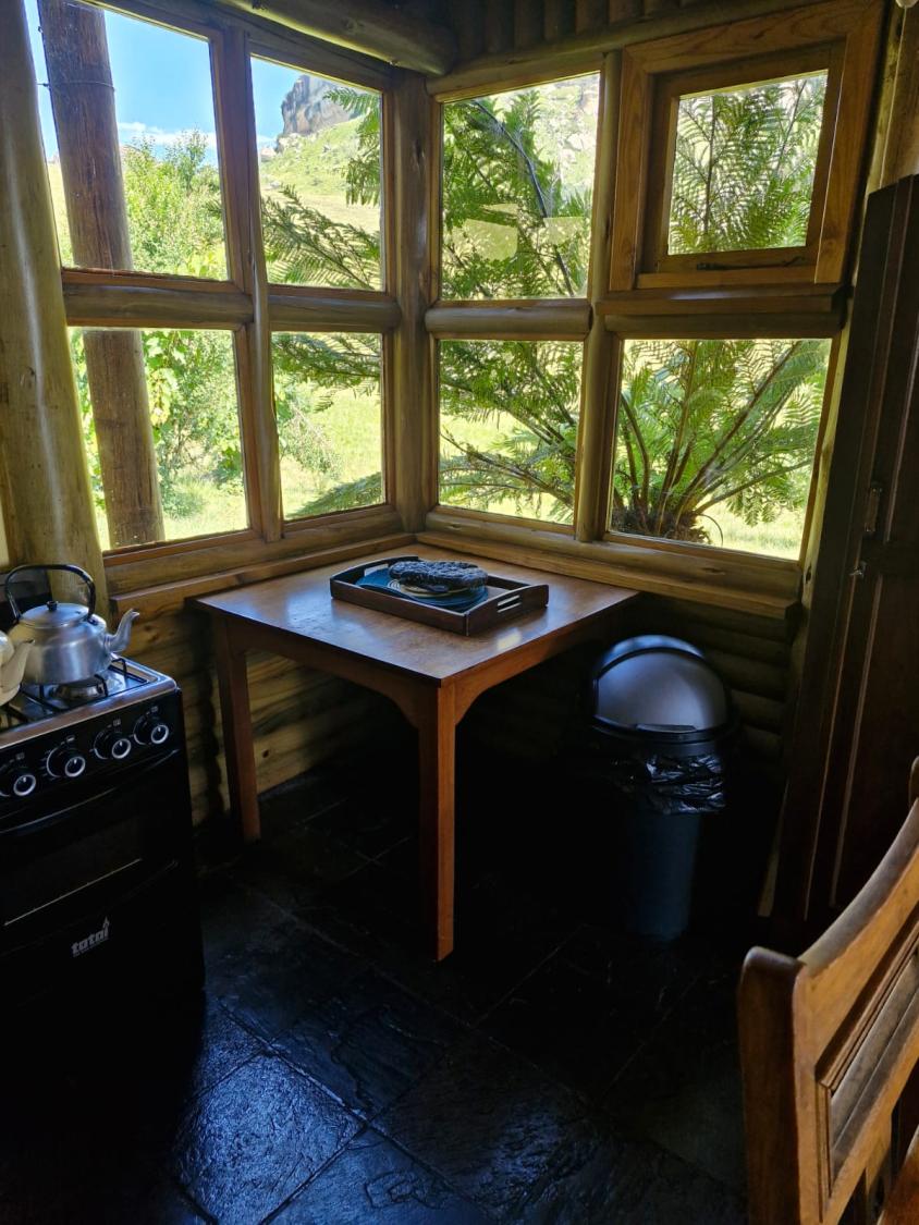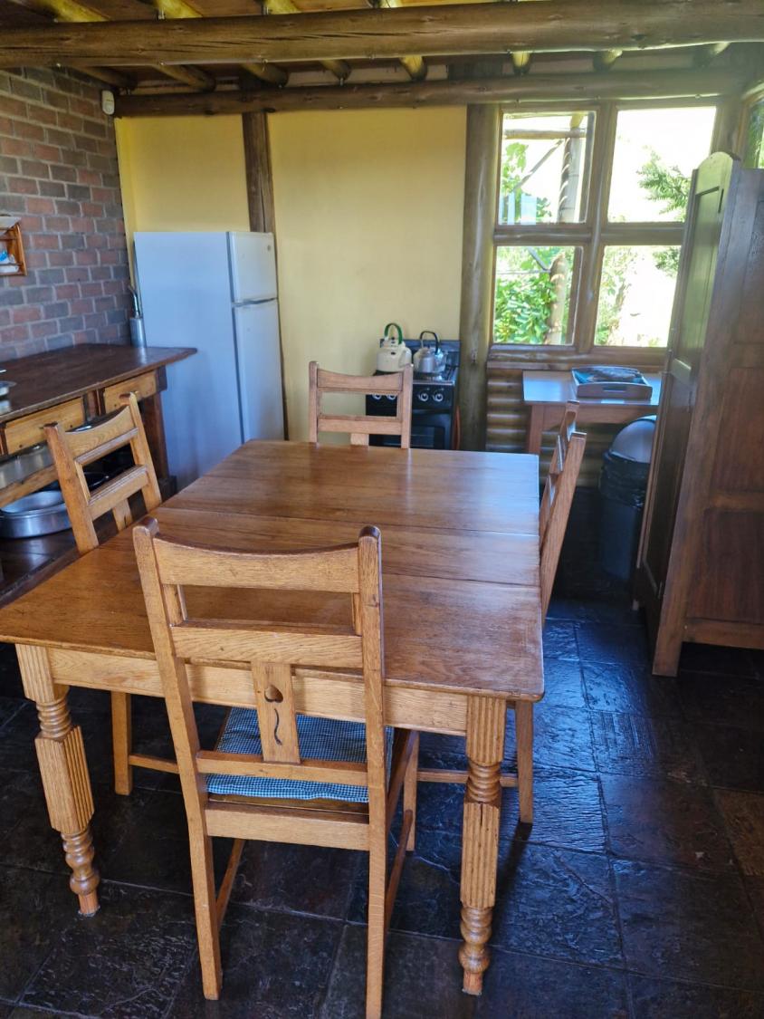 This charming accommodation comfortably sleeps up to six guests, boasting a delightful blend of modern convenience and rustic charm. Upstairs, you'll find two cozy rooms—one furnished with a comfortable double bed and the other with two single beds, perfect for families or groups. Downstairs, the inviting lounge, kitchen, and dining area offer a welcoming space to relax, with an additional room featuring two single beds and a breathtaking view of the mountain majestically reflected in the nearby dam. The fully equipped kitchen ensures you have all the essentials, with cutlery, crockery, and cooking utensils at your disposal. A fireplace and braai area add a touch of warmth and outdoor enjoyment, while the shower and toilet facilities cater to your comfort. This unique retreat also features eco-friendly solar power, a gas fridge, stove, and shower geysers, complemented by candles and oil lamps to create a serene ambiance.
