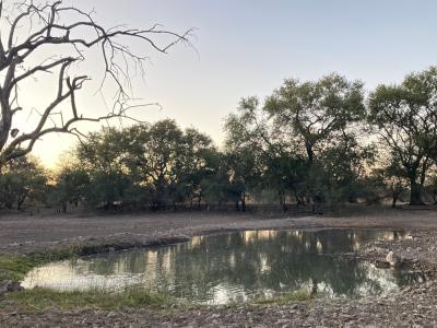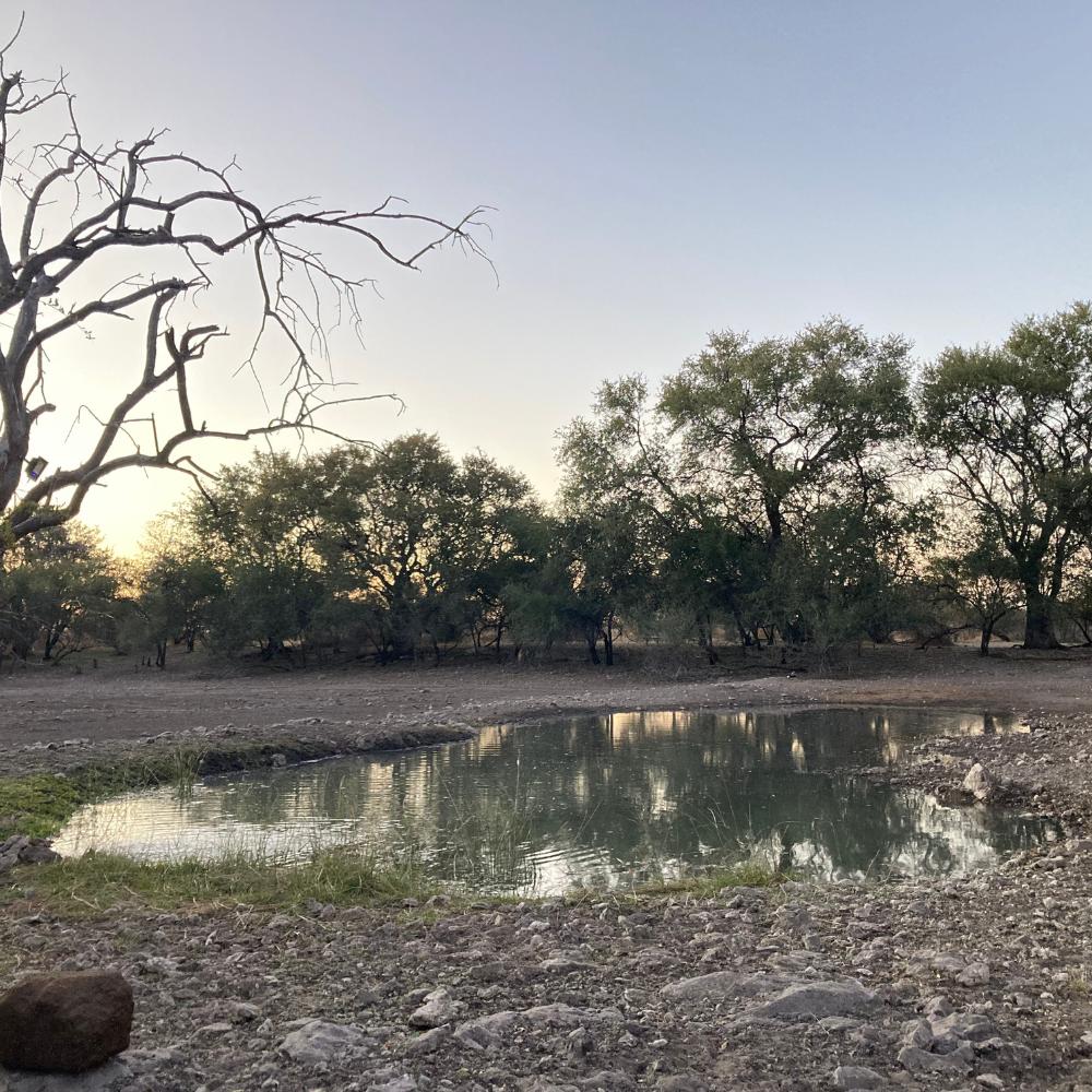 Towering Leadwood trees frame the landscape, creating a serene and picturesque environment. The waterhole regularly attracts a variety of wildlife and bird species, offering guests unforgettable sightings right from camp.