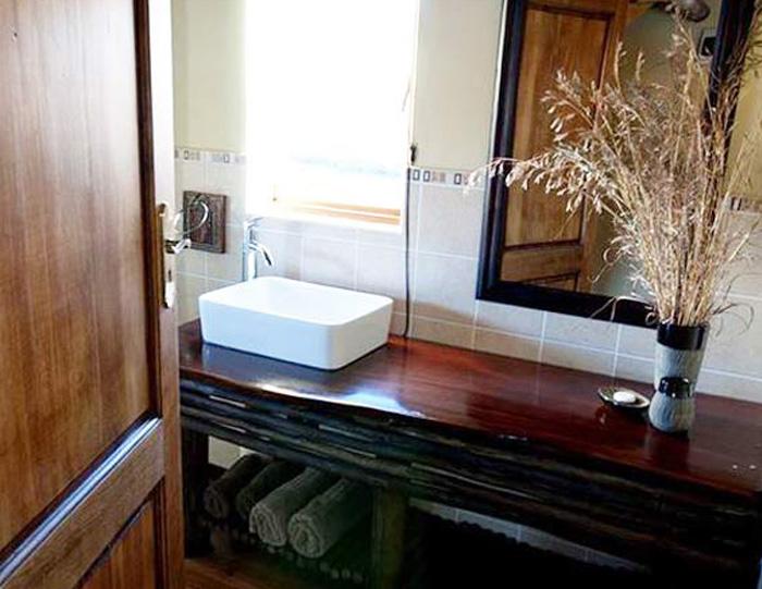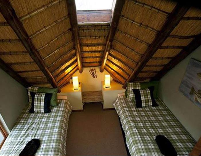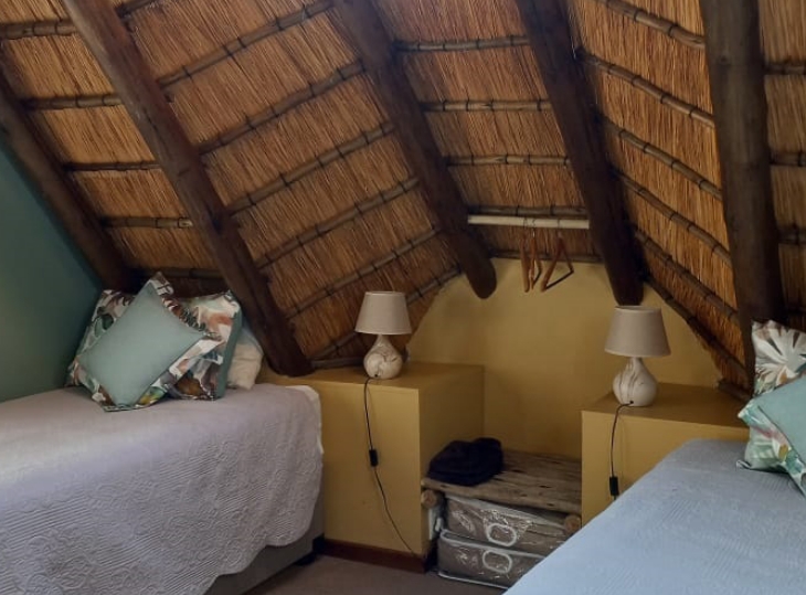 The second bedroom is also situated on the upper level with views of the surrounding mountains. It has twin beds and a bath, basin and toilet.