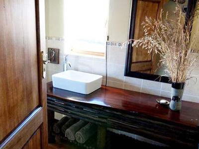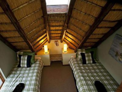 The Bass Bedroom, also on the upper level, has twin beds and a bath, basin, and toilet. The Aloe Bedroom, located on the ground floor, has twin beds which can be joined to form a double bed.