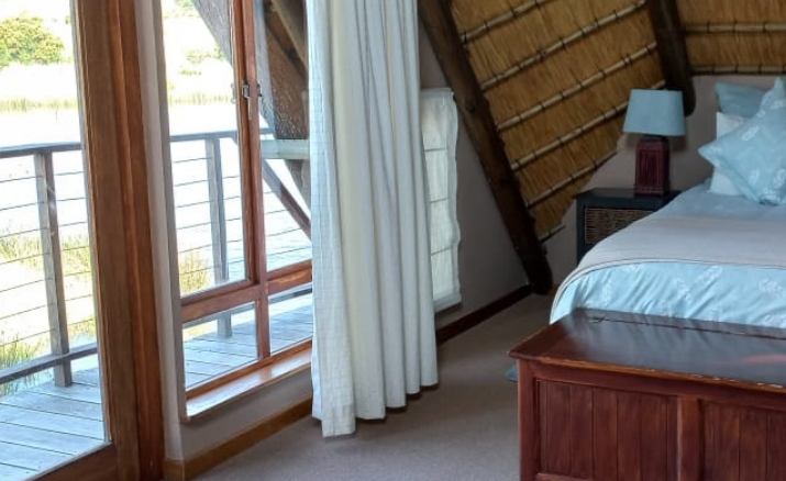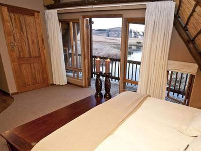 The main bedroom, situated on the upper level has its own private balcony with views across the dam and surrounding farmland. It has a queen bed with shower, basin and toilet.