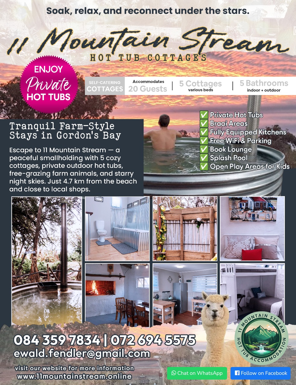 11 Mountain Stream has 5 cottages Our cottages offer a tranquil farm atmosphere with free-grazing farm animals. Each cabin has its own private, outdoor hot tub. Our hot tubs are heated up to 36 degrees Celsius before you arrive.