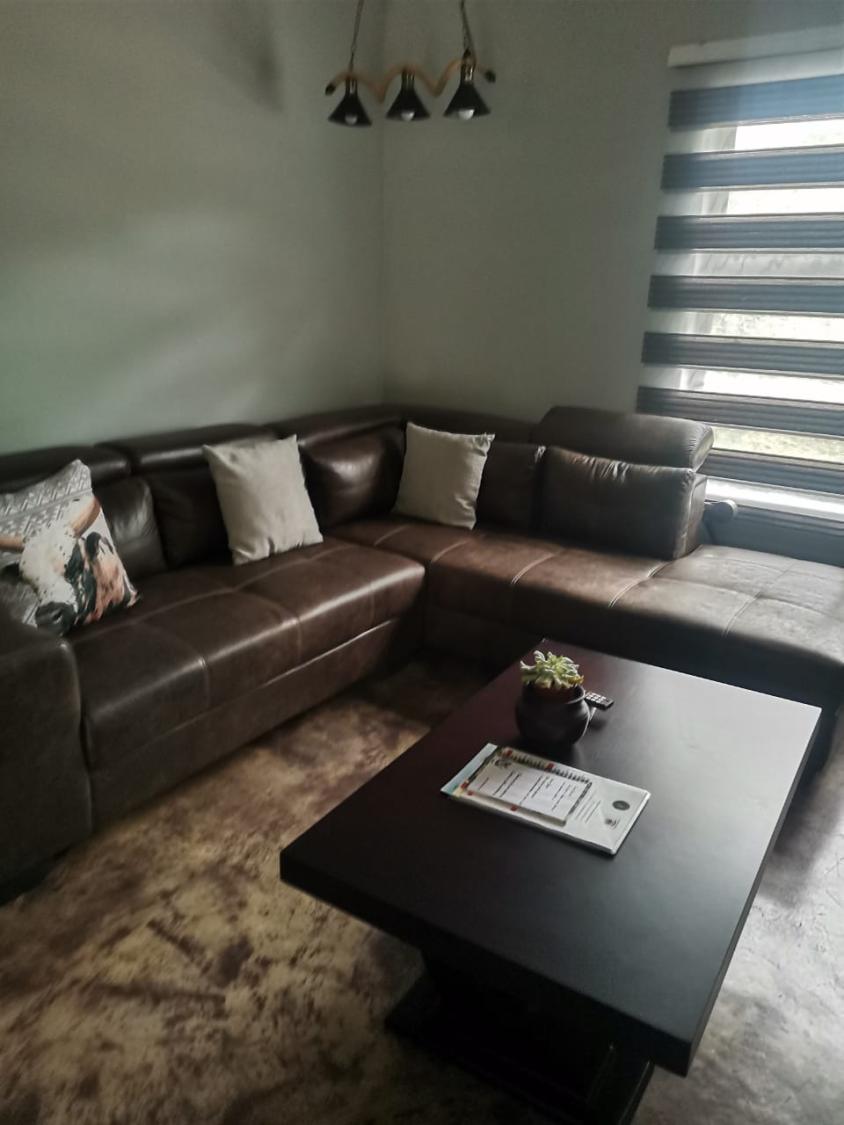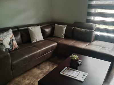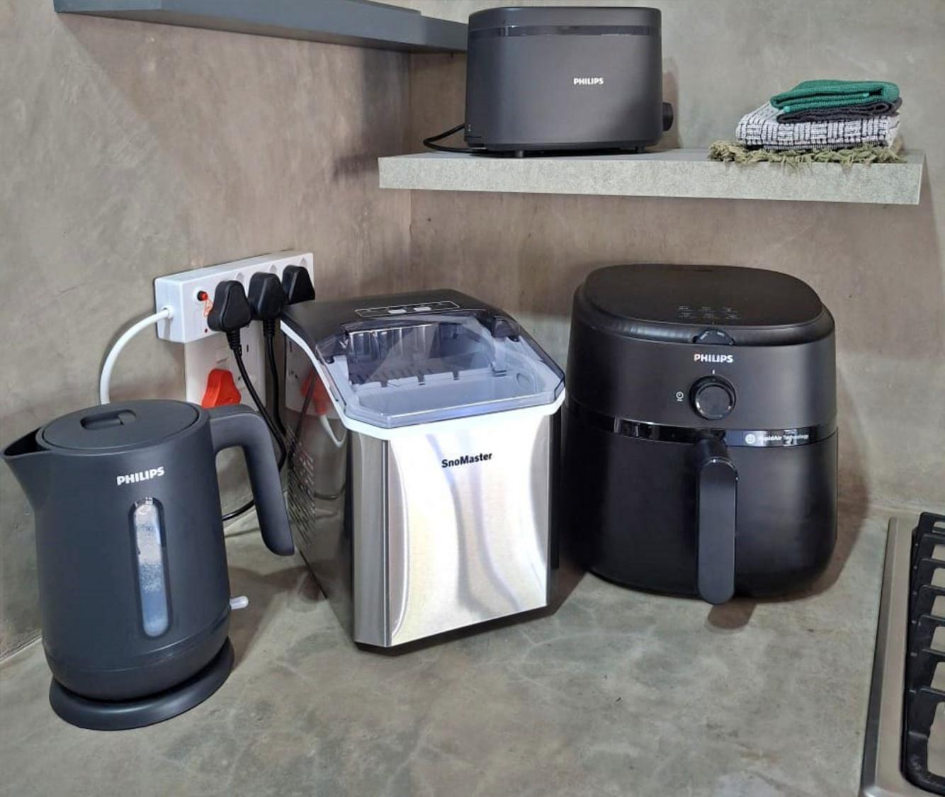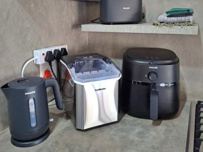 The living area includes a modern kitchen equipped with a fridge-freezer, gas stove, microwave, air fryer,toaster, icemachine, cutlery and crockery, and tea- and coffee-making facilities.