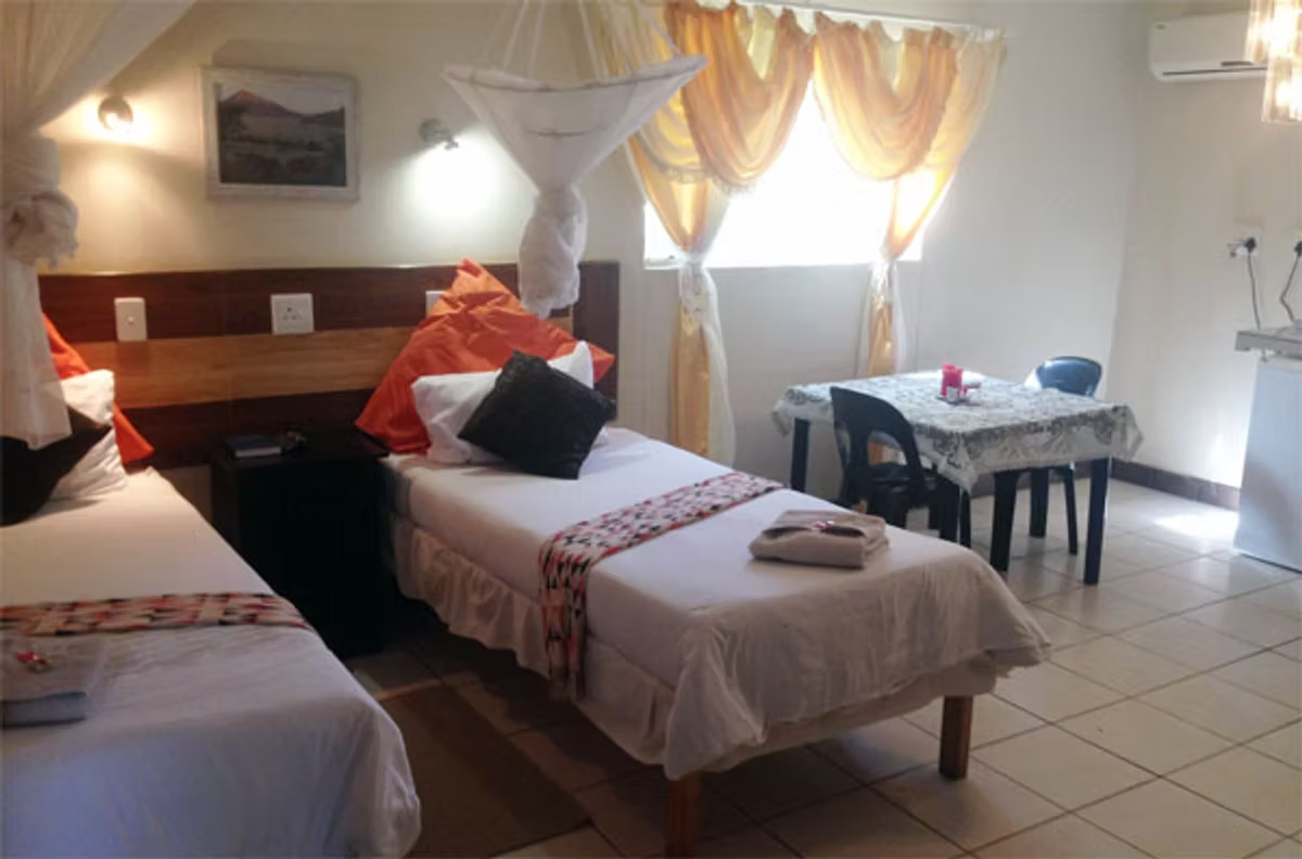 Spacious rooms with DSTV, air conditioning, en-suite bathrooms, and kitchenettes