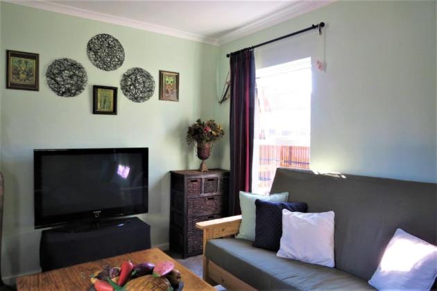 Enter with a sliding door in front of your own parking bay walking straight into the spacious living room and open plan kitchen. The main bedroom is nice and spacious with a separate bathroom. The kitchen door exits towards the communal pool and deck chairs.