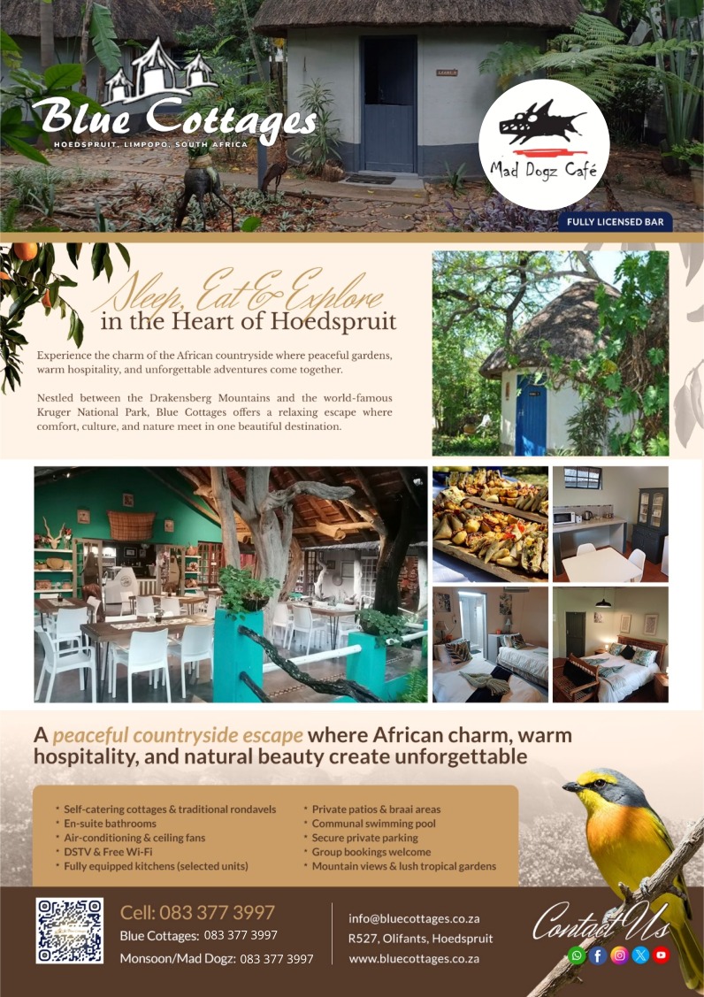 What more do you need? You will find The Blue Cottages country house, Mad Dogz Restaurant and Monsoon gallery at one location. Our mission is to create a place where people can come to find and discover anything they might want to in the beautiful Hoedspruit area.