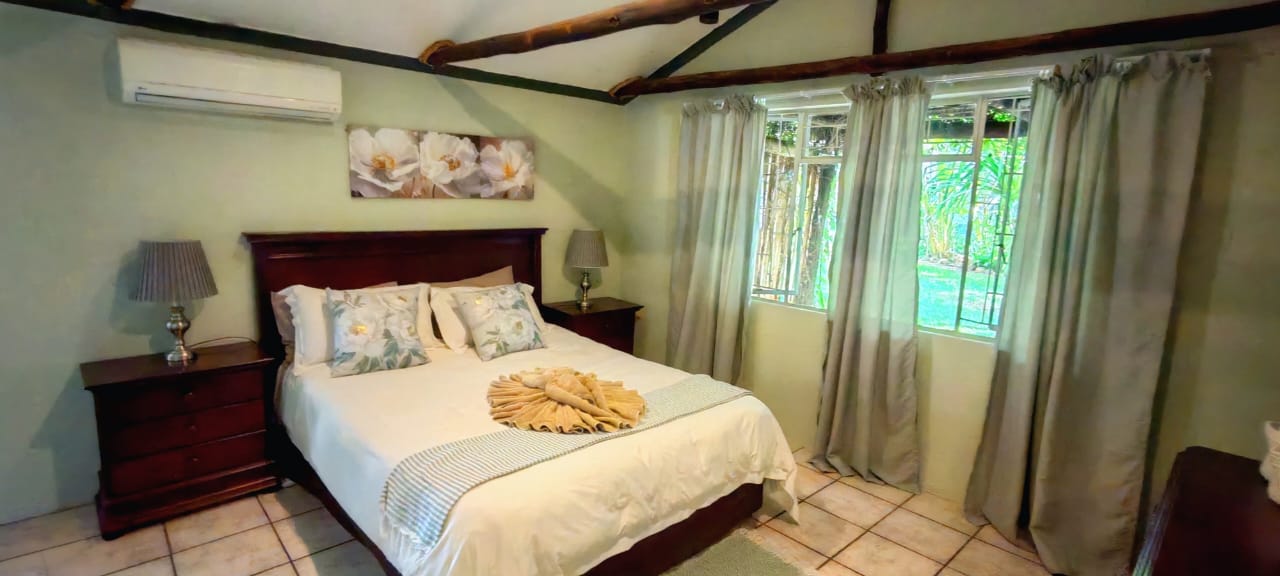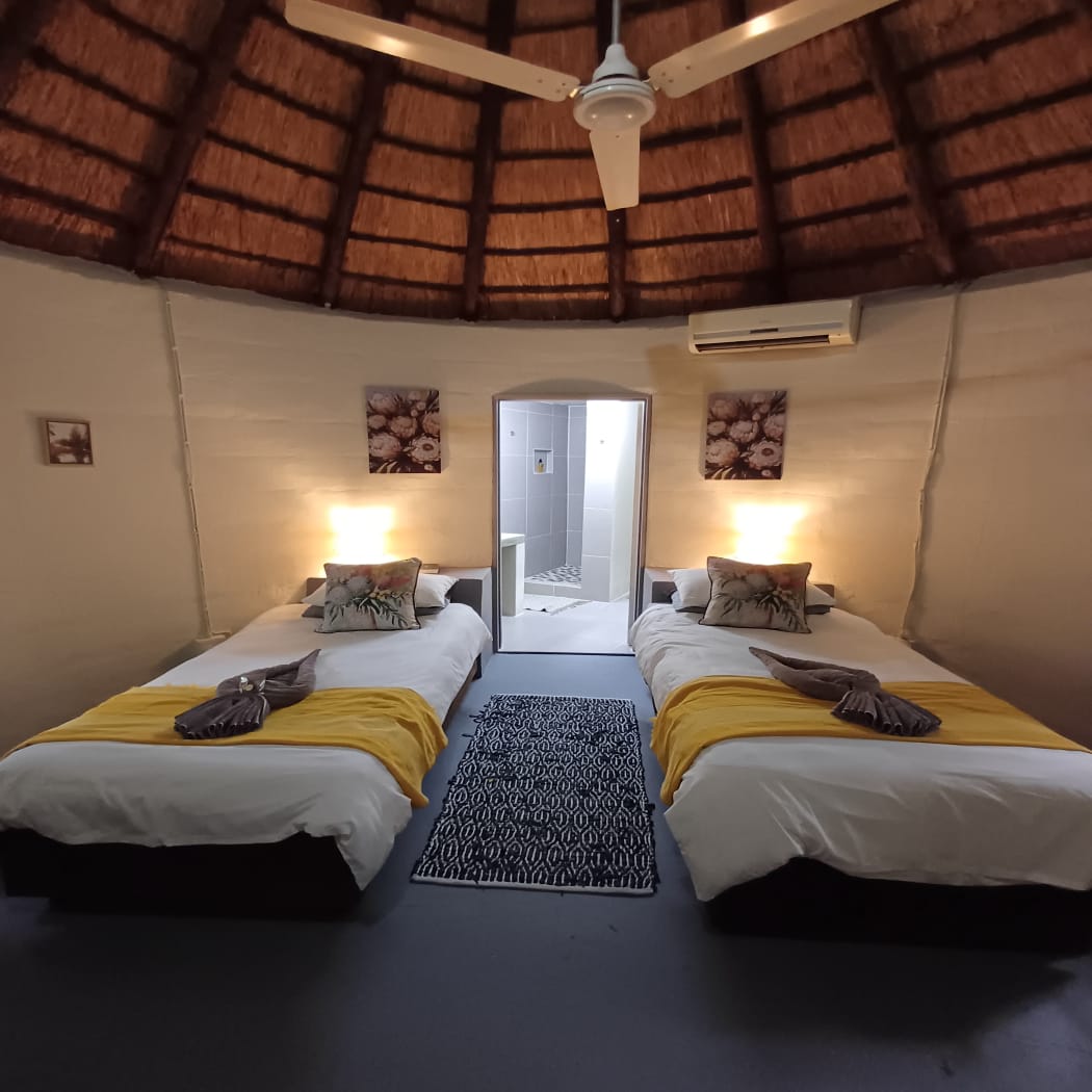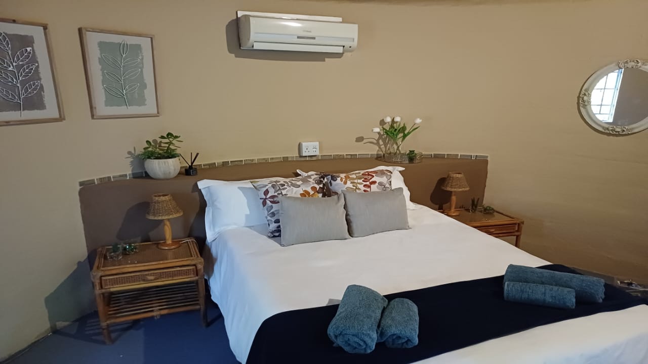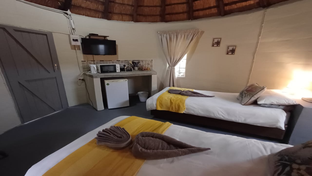 One bedroom rondavel with double bed, aircon, Wi-fi, DSTV and a bar fridge, en-suite bathroom,toilet and shower. Private barbeque area. We serve meals at the COTTAGES and at our MAD DOGZ CAFE` ( ANY MEAL SERVE FOR OWN ACCOUNT) Communal swimming pool
