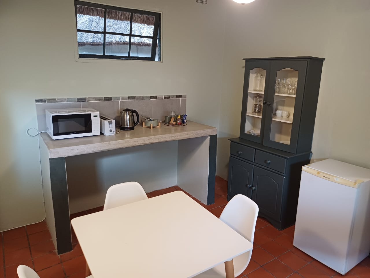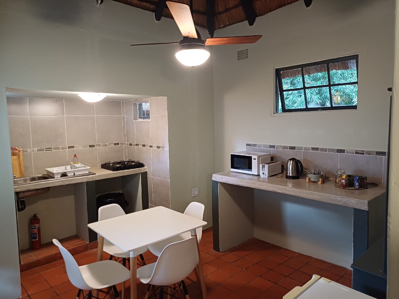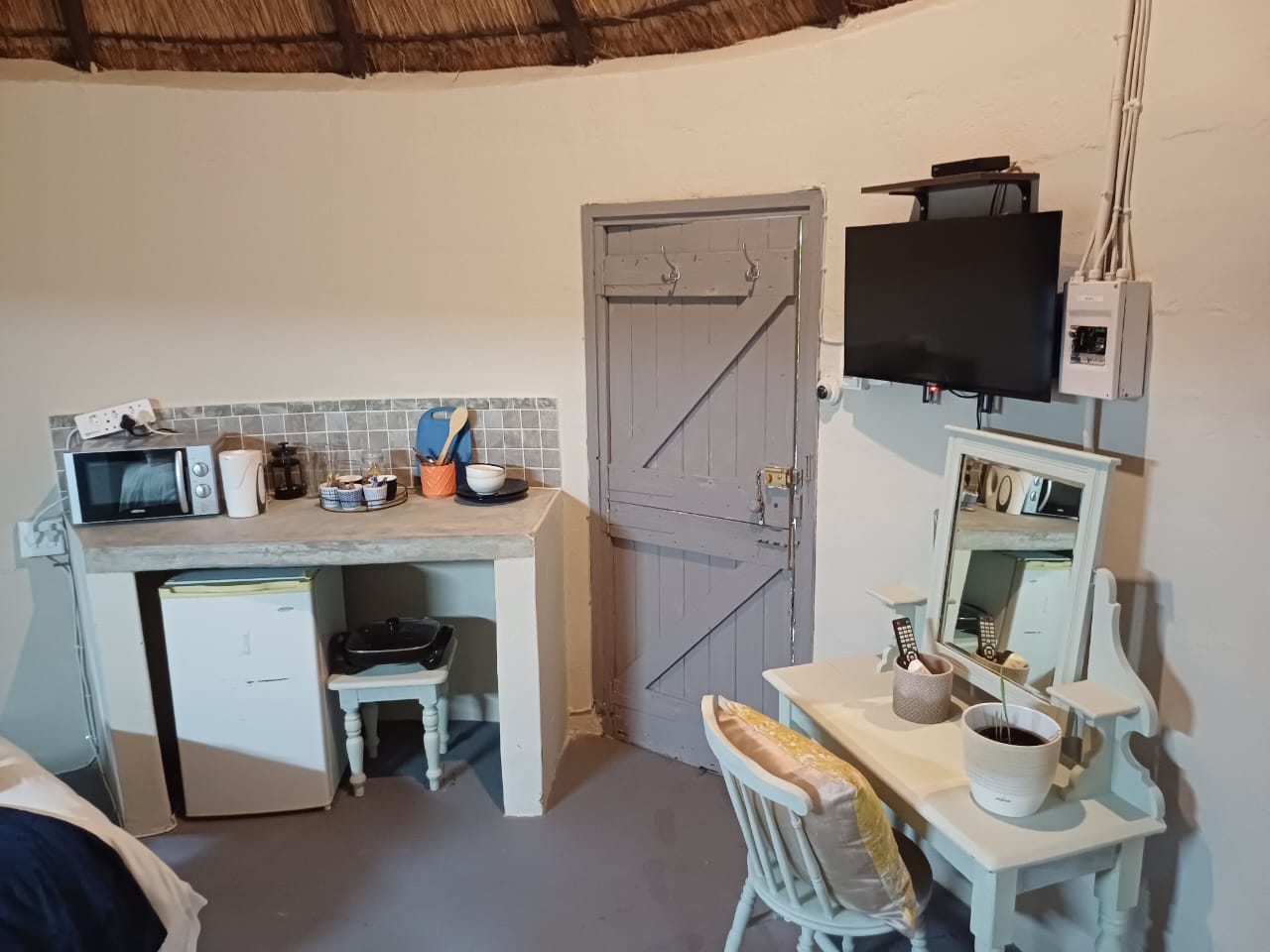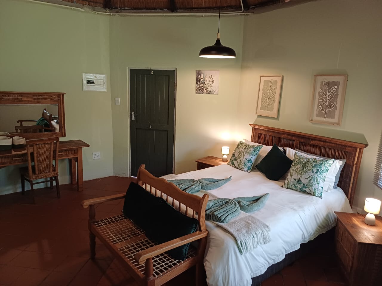 One bedroom rondavel with double bed, aircon, Wi-fi, DSTV and a bar fridge, en-suite bathroom,toilet and shower. Private barbeque area. We serve meals at the COTTAGES and at our MAD DOGZ CAFE` ( ANY MEAL SERVE FOR OWN ACCOUNT) Communal swimming pool