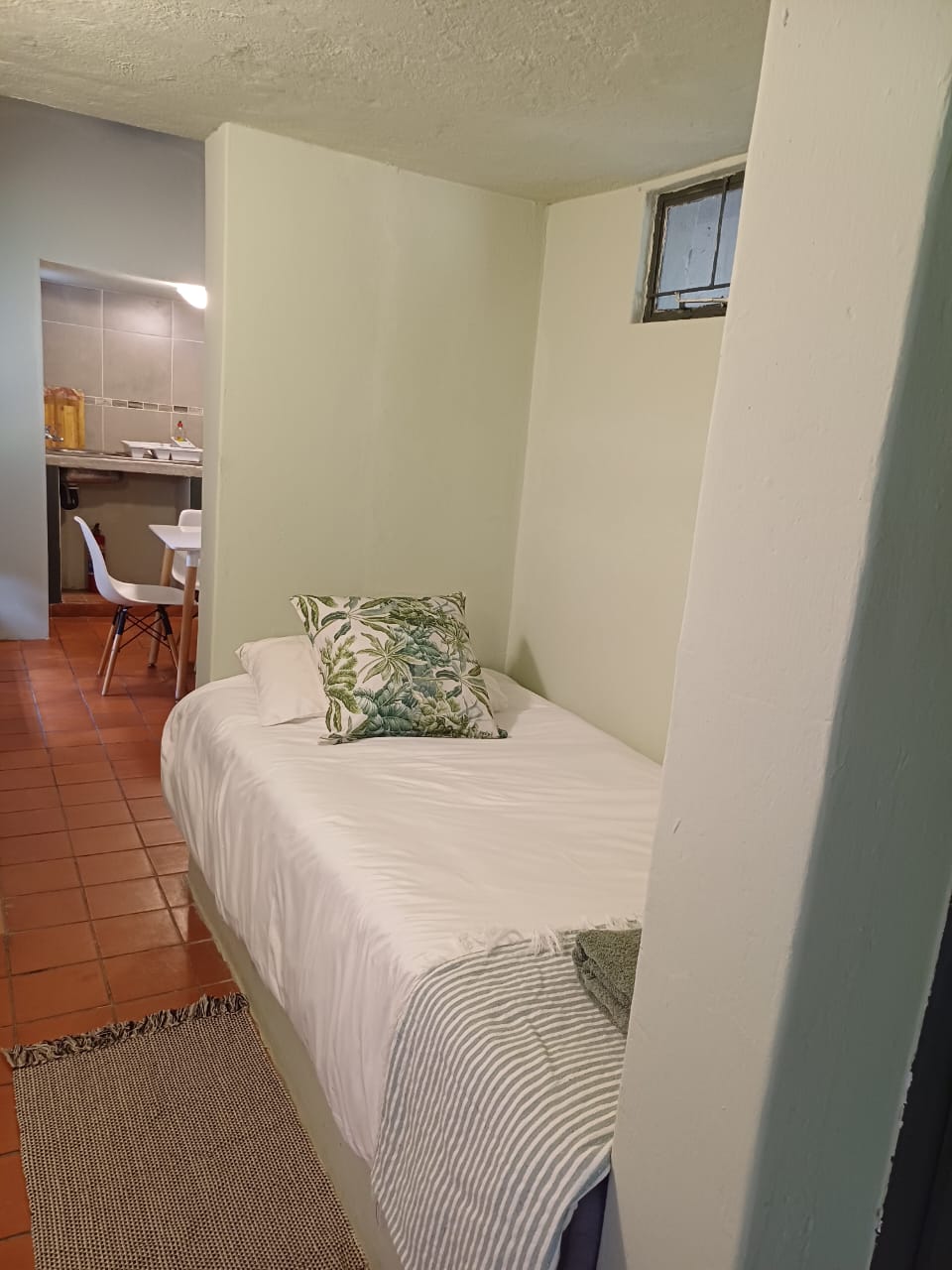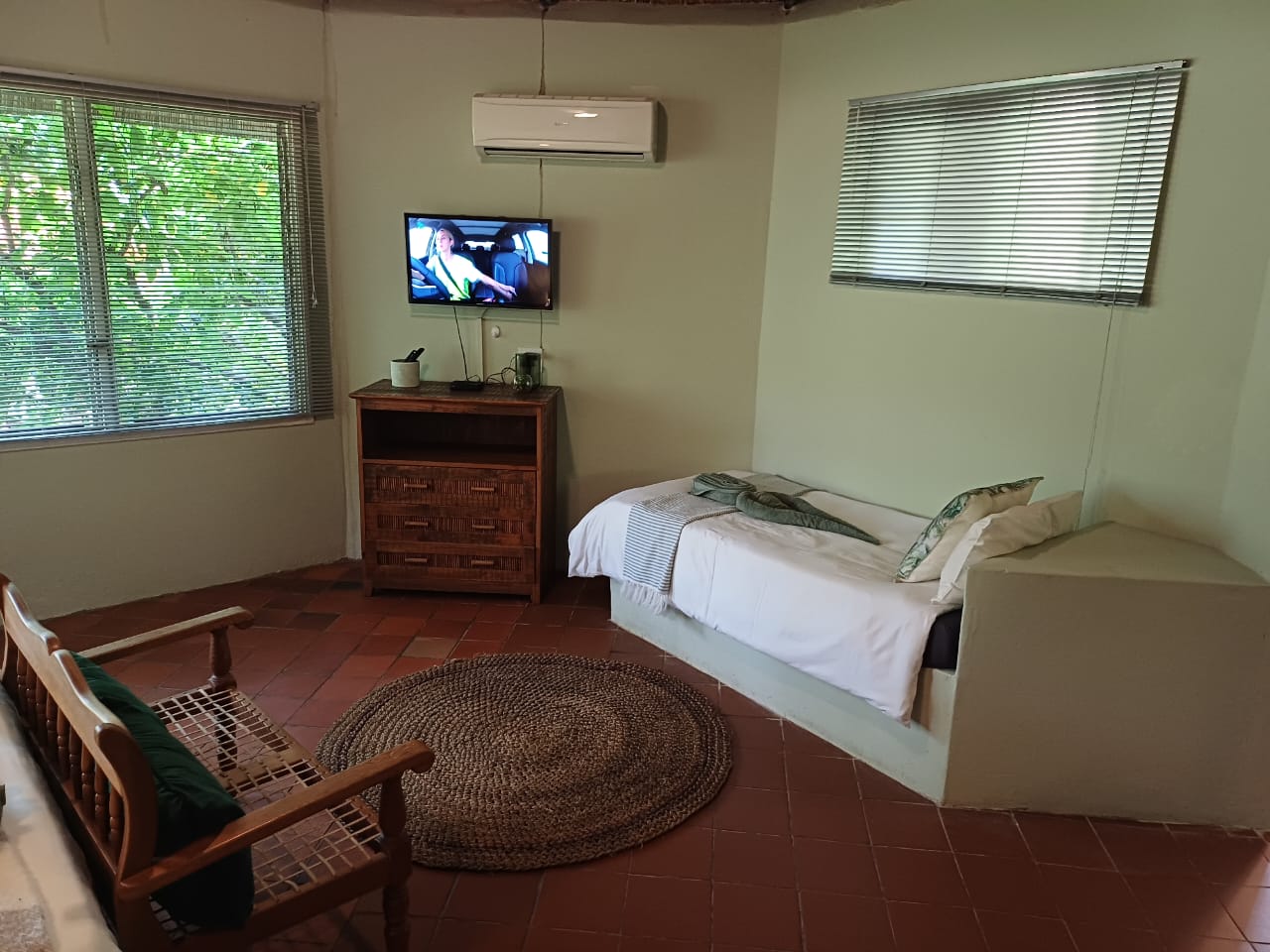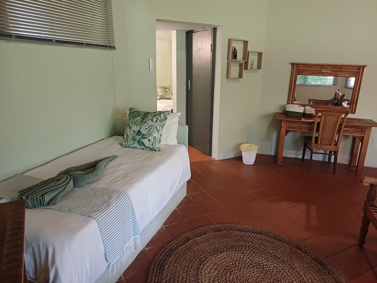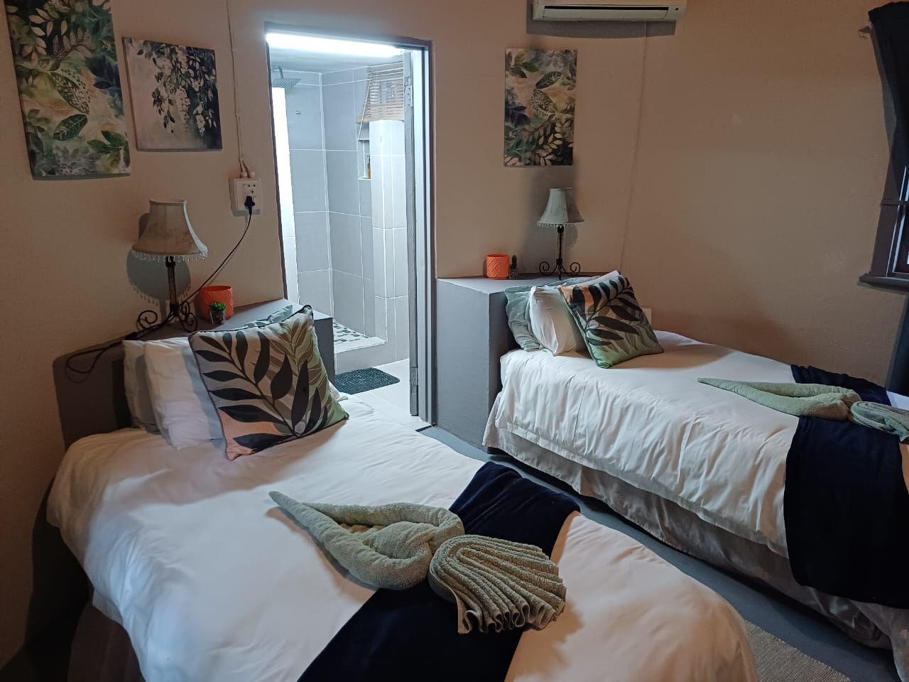 One bedroom with two single beds and en-suite shower and toilet, DSTV, aircon, roof fan, Wi-fi, bar fridge. We serve meals at the COTTAGES and at our MAD DOGZ CAFE` ( ANY MEAL SERVED FOR OWN ACCOUNT ) Communal swimming pool.