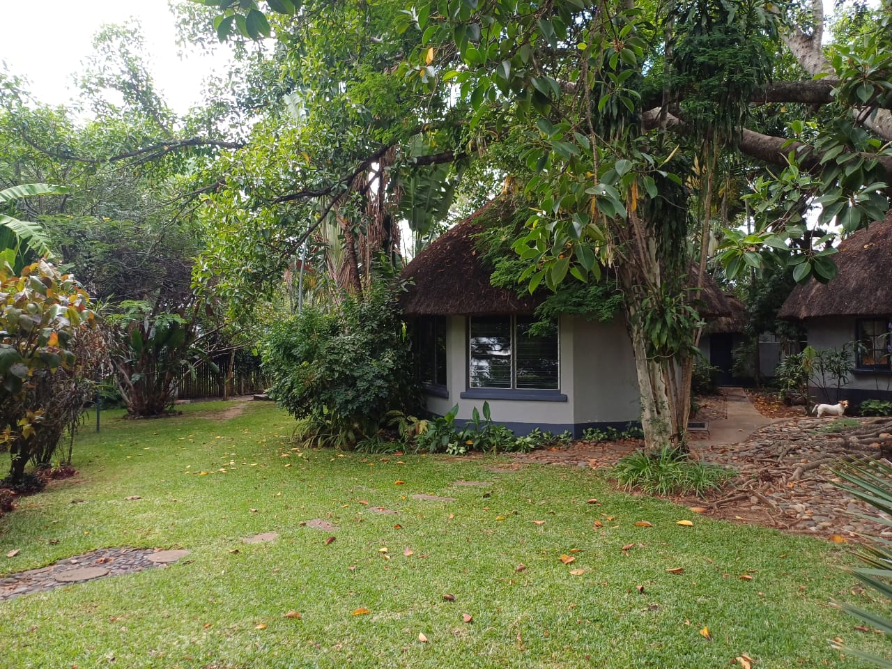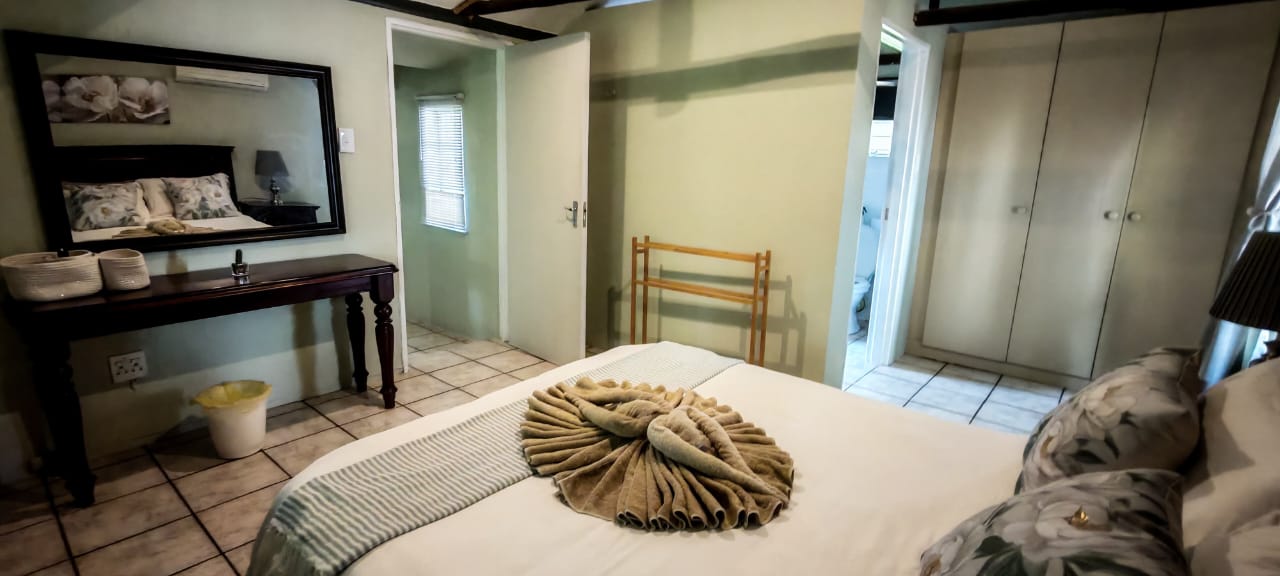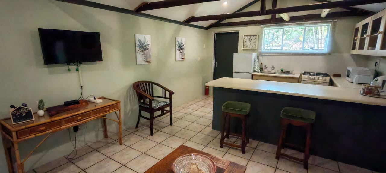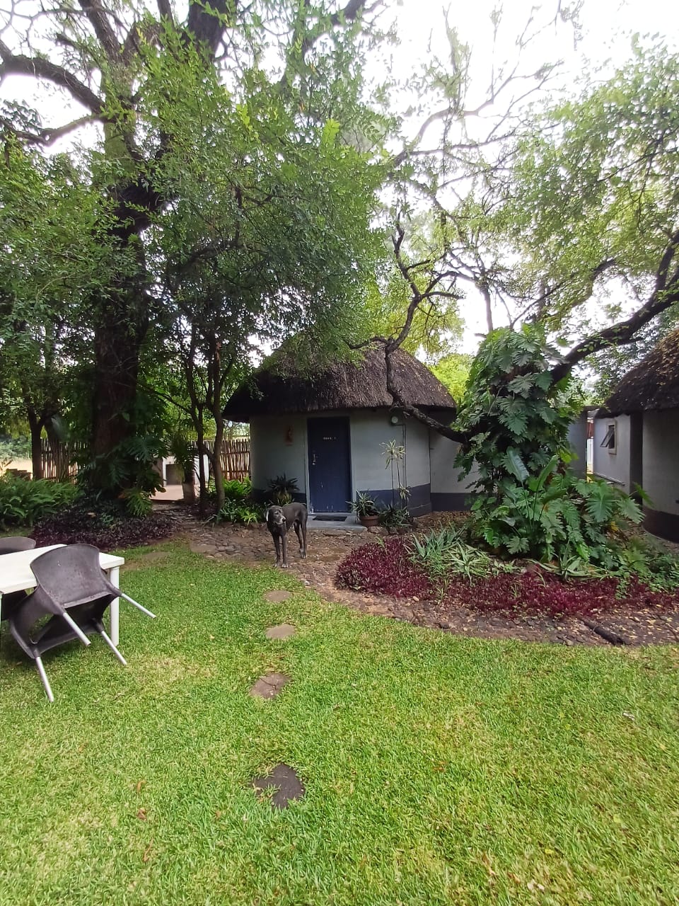 Luxury double bed garden cottage,air-con,fully equiped kitchen,lounge, en-suite bathroom, DSTV, Wi-fi, private patio and barbeque . We serve meals at the COTTAGES and at our MAD DOGZ` CAFE ( ANY MEAL SERVED FOR OWN ACCOUNT) Communal swimming pool