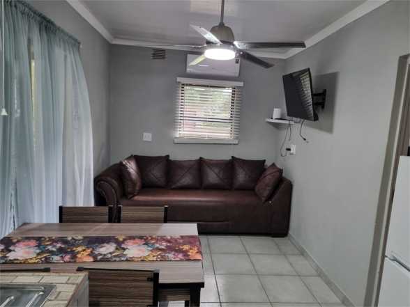 For outdoor relaxation and dining, guests have access to a communal pool, braai facilities, and a covered patio with an outdoor dining table.