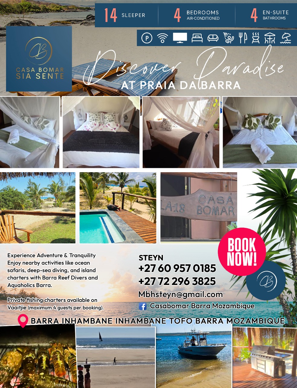 Located in the stunning Sia Sente Estate, Praia da Barra, Inhambane, Mozambique, Casabomar Barra Beach Villa is the ultimate beachfront retreat for families, friends, and corporate teams.