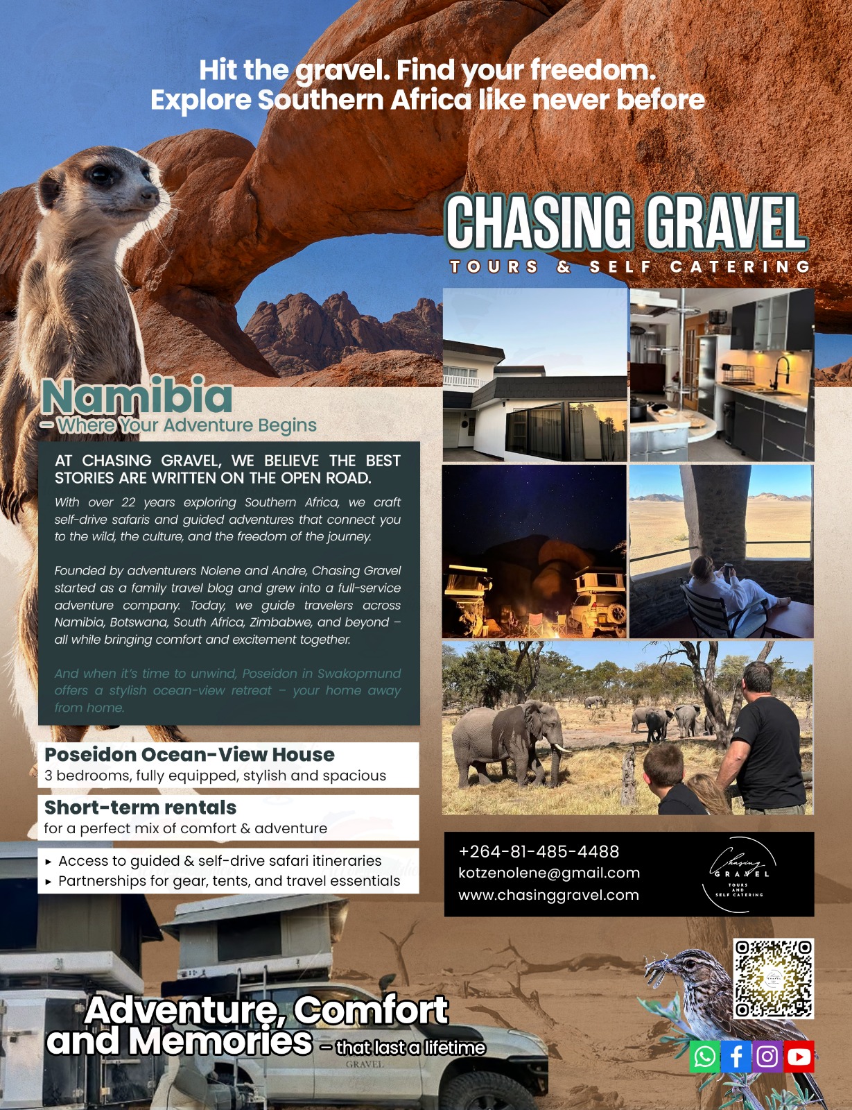 Today, Chasing Gravel combines tailor-made safari itineraries, travel coaching, and even a home base in Poseidon (Swakopmund, Namibia) — bringing adventure and comfort together for travelers worldwide.