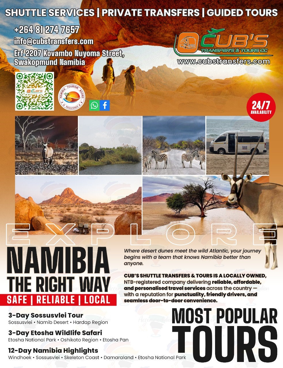 Cubs Transfer and Tours CC is a locally owned and NTB-registered transport and tour company offering reliable, affordable, and personalized travel services across Namibia.