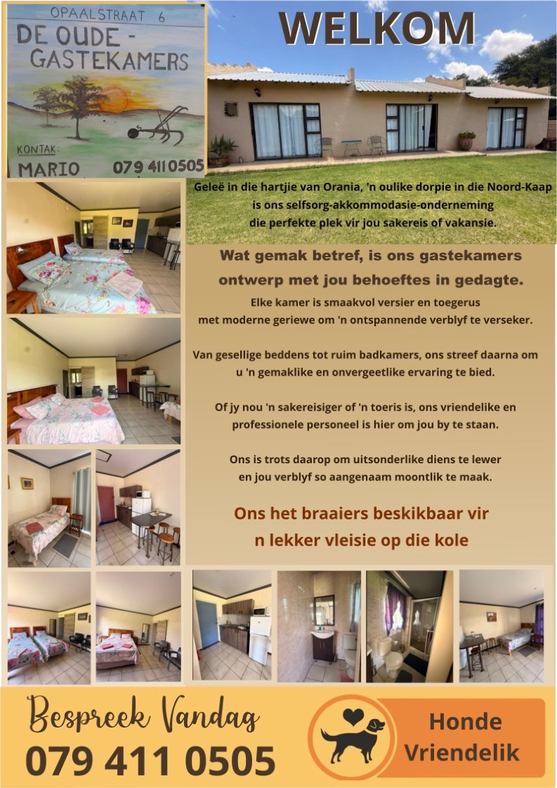 Geleë in die hartjie van Orania, 'n oulike dorpie in die Noord-Kaap van Suid-Afrika, is ons selfsorg-akkommodasie-onderneming die perfekte plek vir jou sakereis of vakansie.