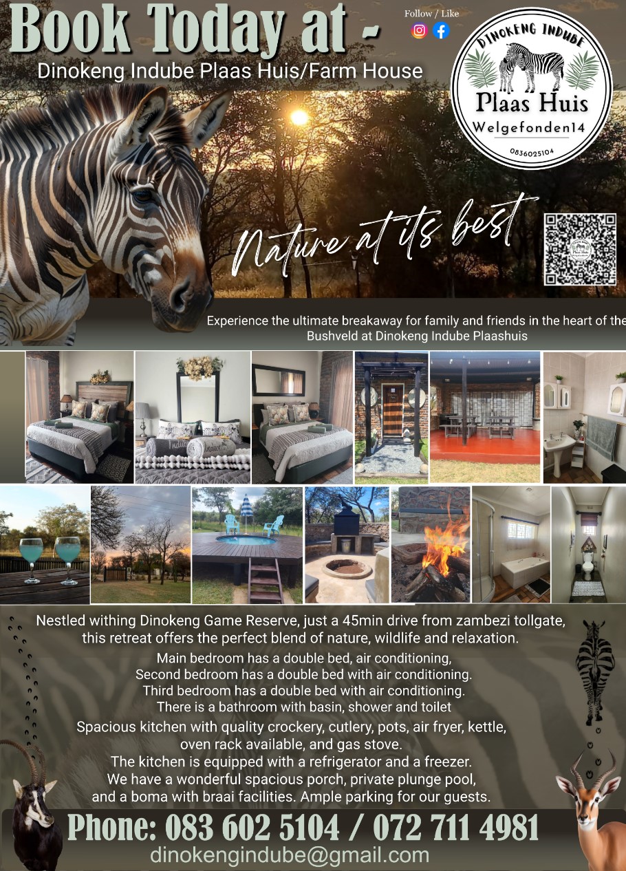 Dinokeng Indube Plaashuis het n heerlike ruim stoep, privaat plons swembad en boma met braai geriewe.