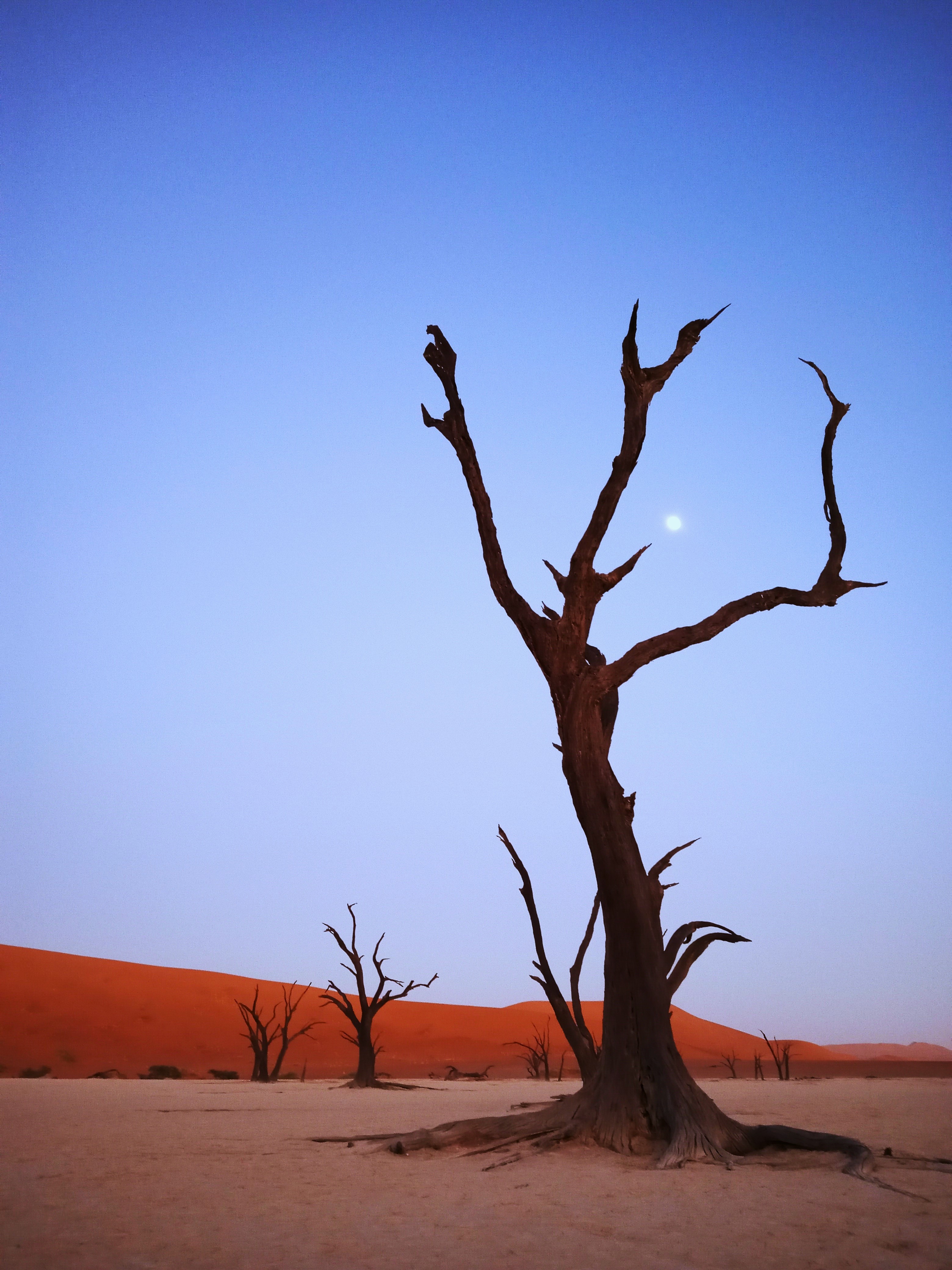 Witness the hauntingly beautiful landscape of dead trees silhouetted against the vibrant Namib Desert sands.