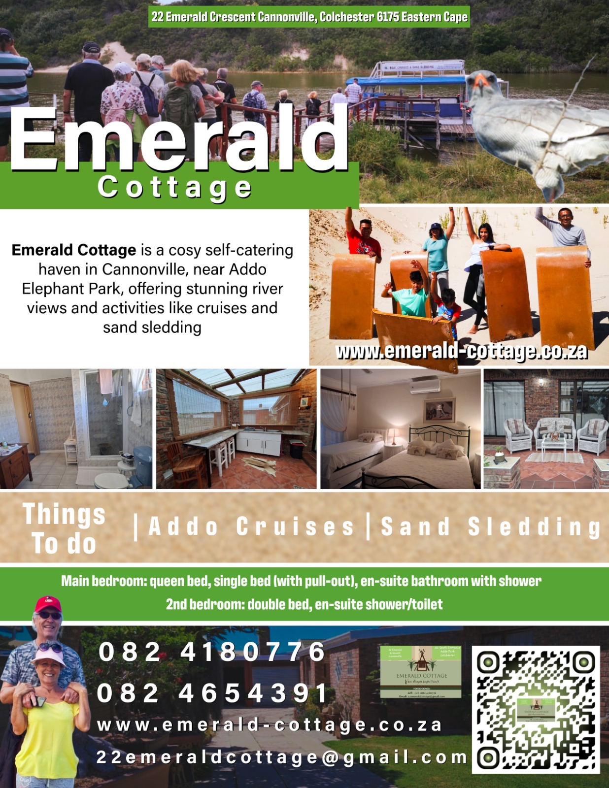 Emerald Cottage is a self catering accommodation facility. Conveniently situated in Cannonville, a safe and tranquil village on the banks of the beautiful Sundays River, only 35km East of Port Elizabeth, Nelson Mandela Bay, on the N2 in the Greater Addo area. Located only 3km from new South gate entrance also known as CAMP MATYHOLWENI, to the Addo Elephant National Park and a short walk around the corner to The Sundays River.