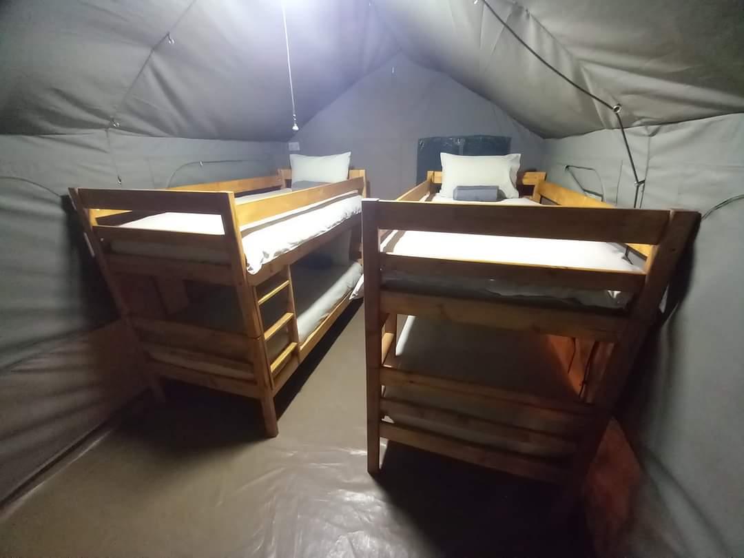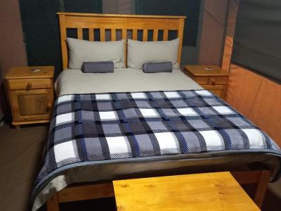 - Tented Chalet (6 sleeper): 2-bedroom chalet with 1 double bed, 2 bunk beds, fully kitted kitchen, own bathroom (shower only)