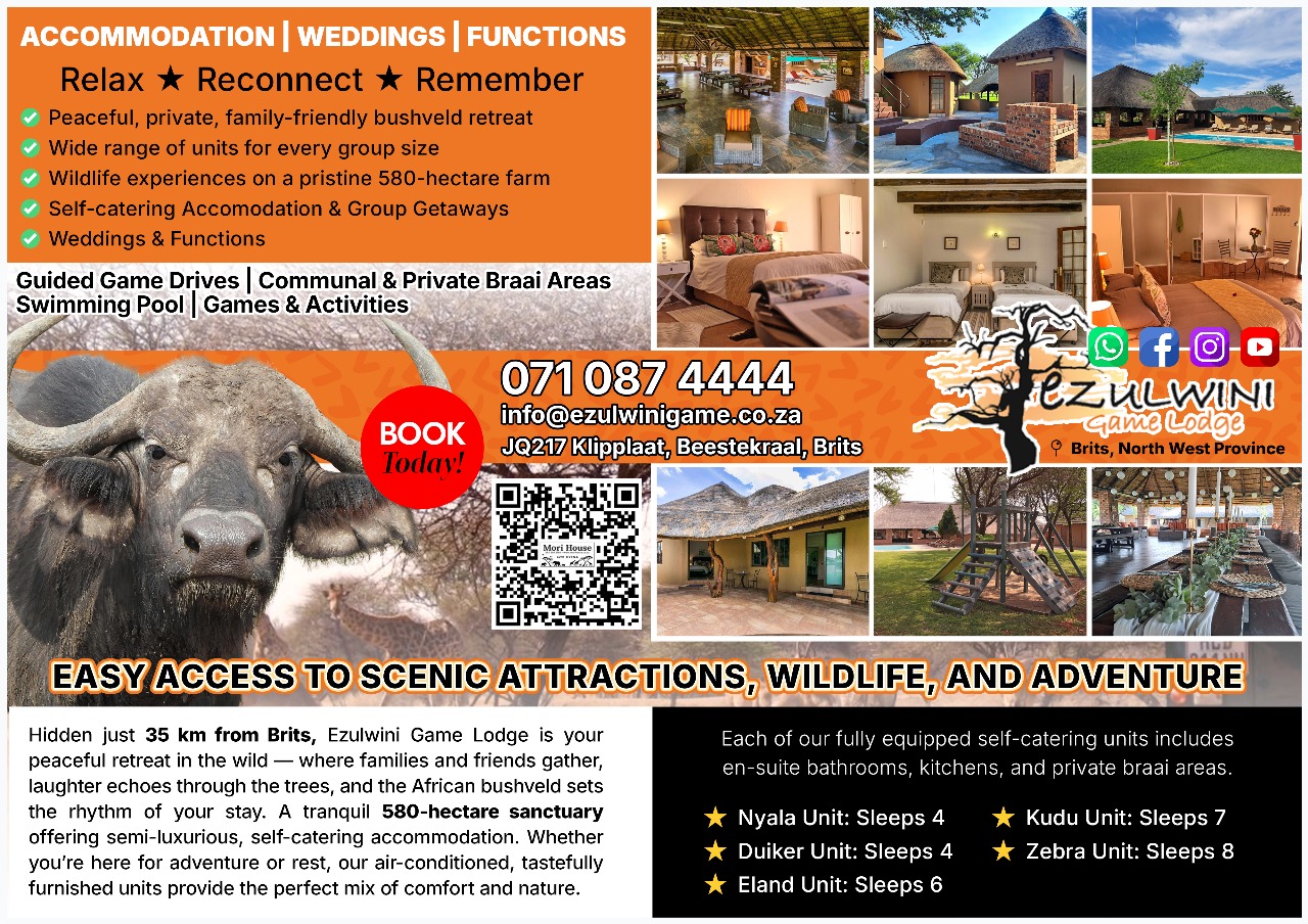 Welcome to Ezulwini Game Lodge, a picturesque bush retreat nestled approximately 35 km from Brits in the heart of the North West province.
