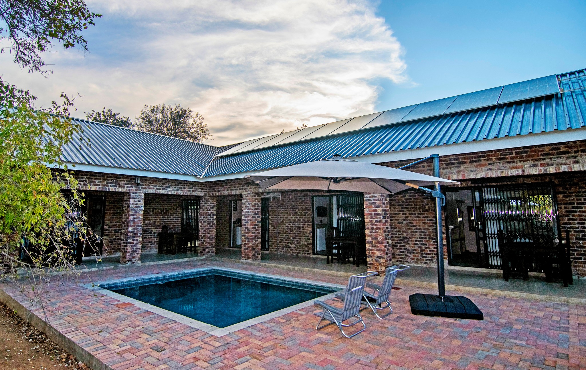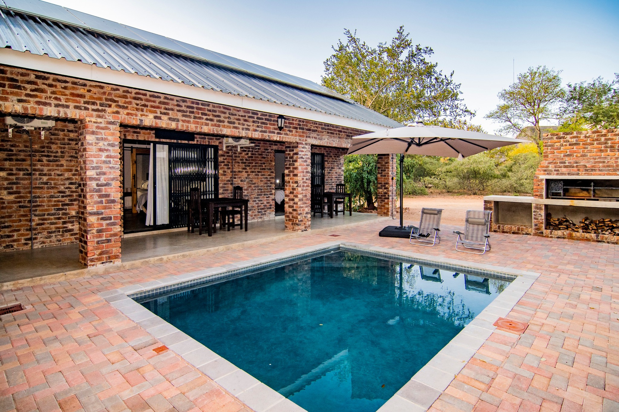 Guests can relax in the cozy braai area with benches and a splash pool.