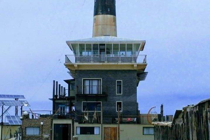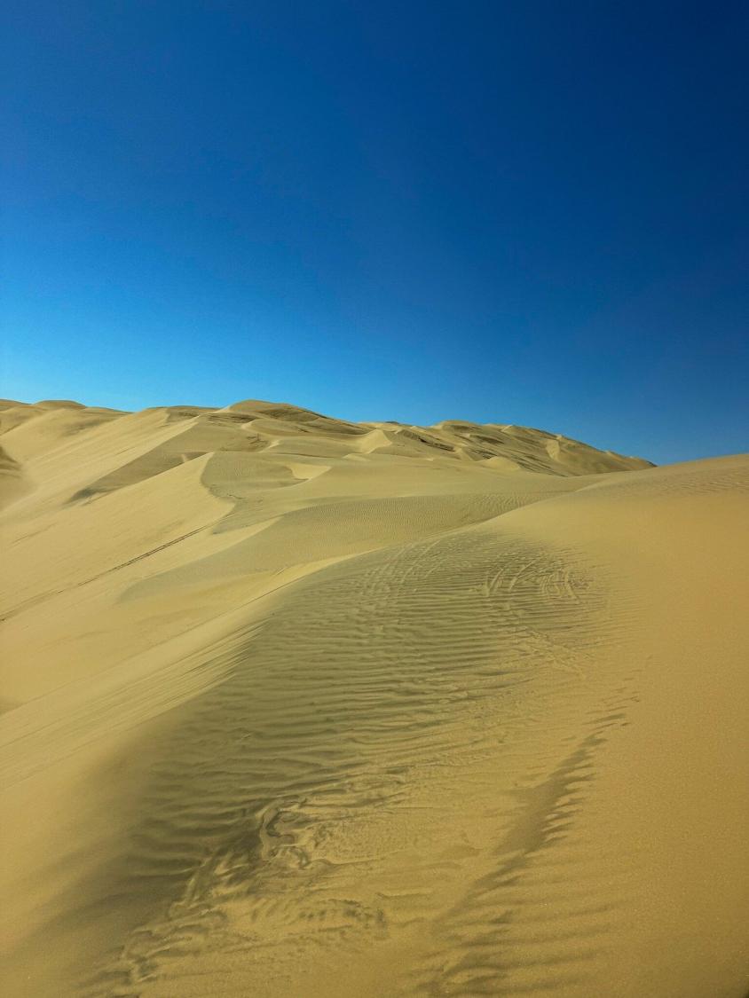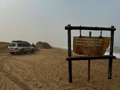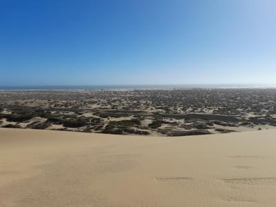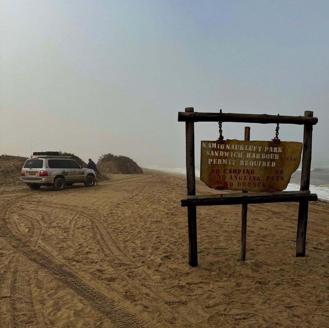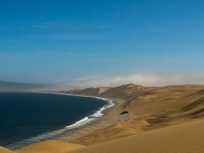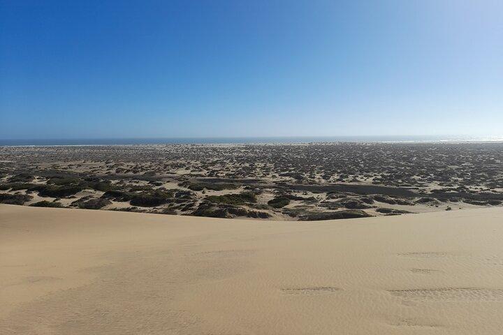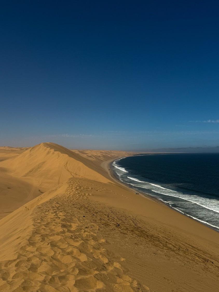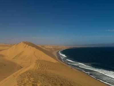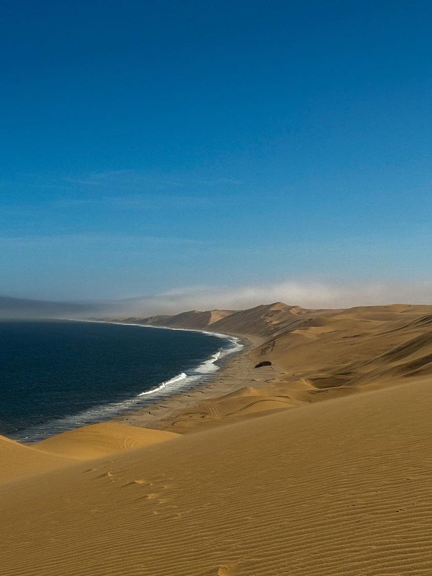 Experience the breathtaking beauty of Sandwich Harbour, where colossal sand dunes meet the Atlantic Ocean.
