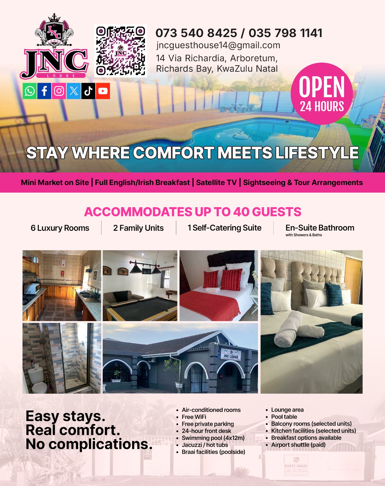 Jnc Lodge provides accommodation in Richards Bay with access to a casino, a garden, as well as a 24-hour front desk.