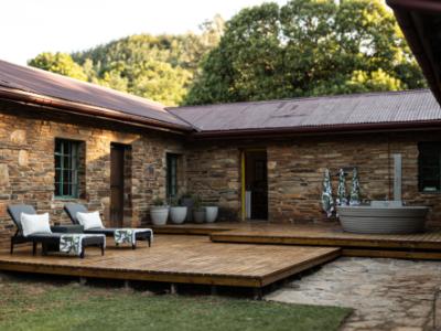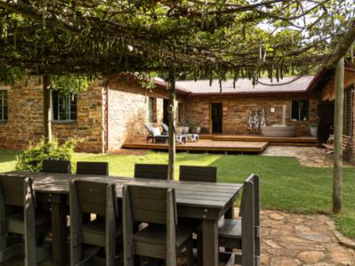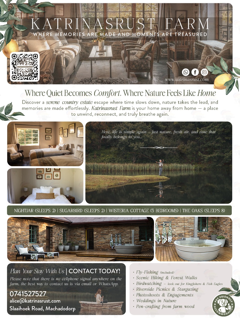 Nestled in a beautiful English-inspired garden that was designed and lovingly tended to by Avril Brewer for many years, Wisteria Cottage is the original farmhouse on Katrinasrust. The cottage recently underwent a renovation, completed in December 2019, which has produced four bathrooms and five bedrooms of a very luxurious standard, as well as a beautiful living and dining room space that leads out onto the garden. The cottage boasts a spacious mud room for all kinds of fishing and outdoor gear, all modern appliances in the cozy farm-style kitchen and an outdoor braai and pizza area.