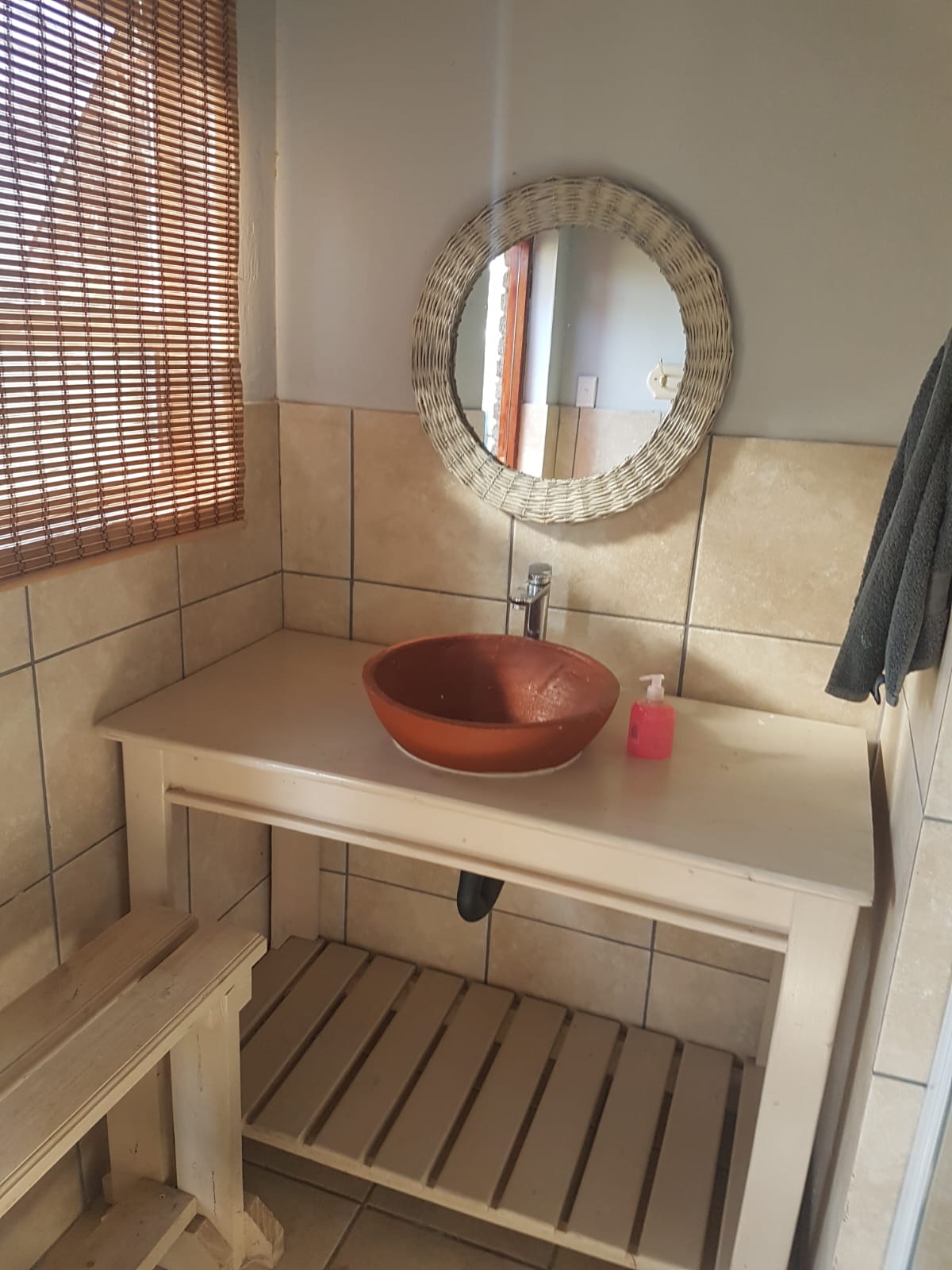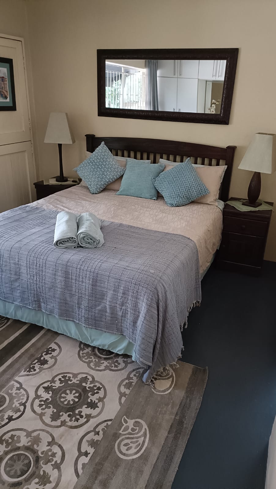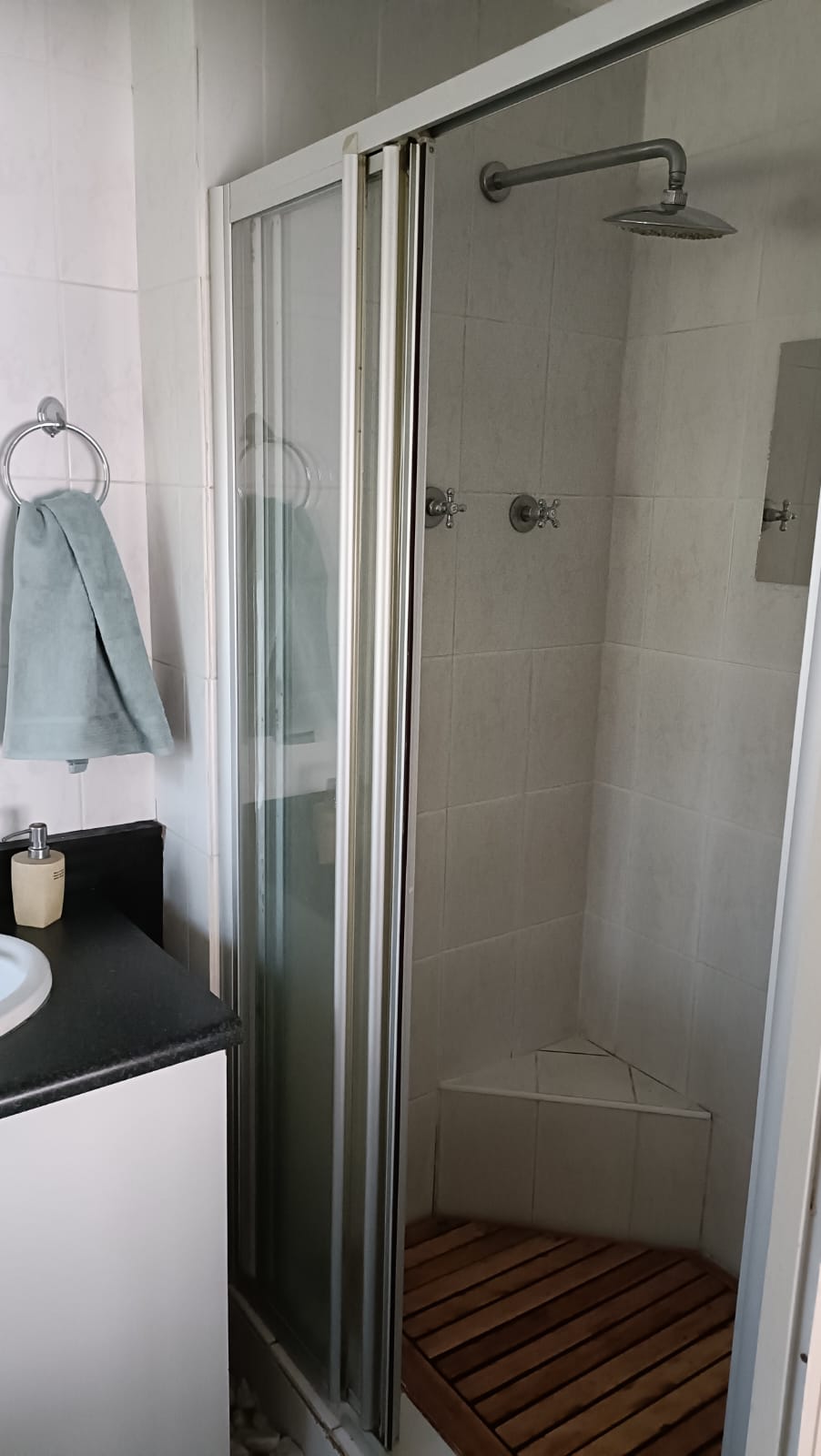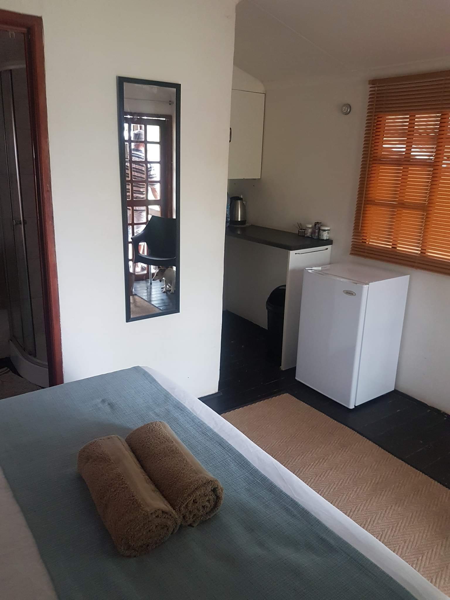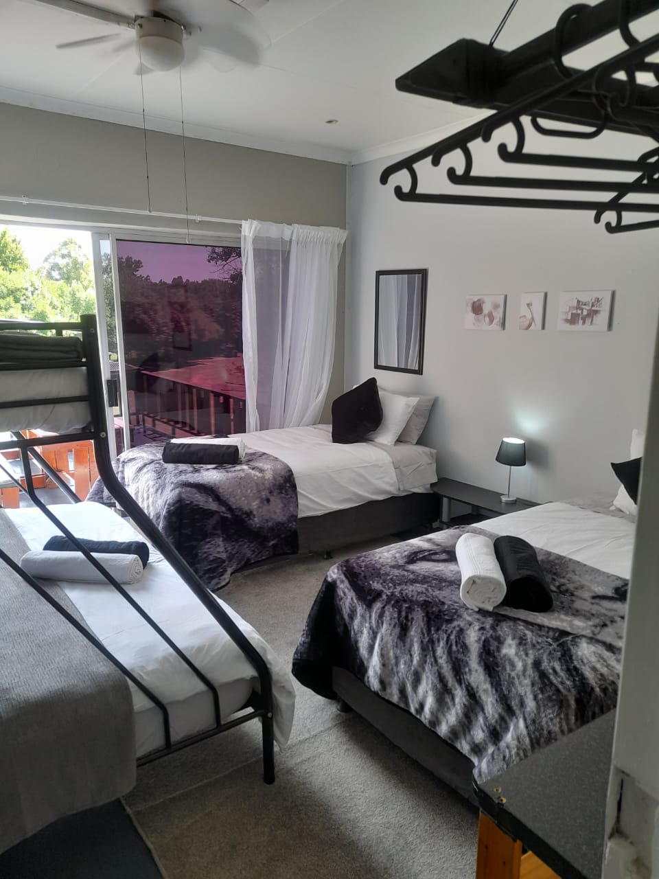 A screen separates the queen bed from the double bed. It has its own shower, toilet and basin in the room.