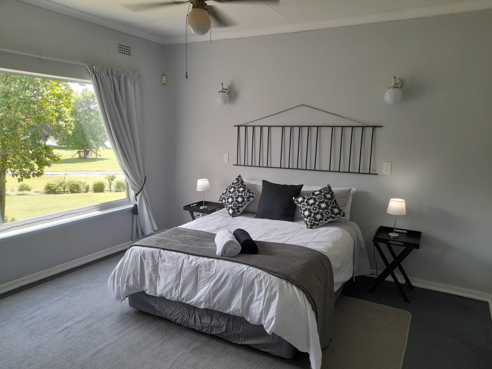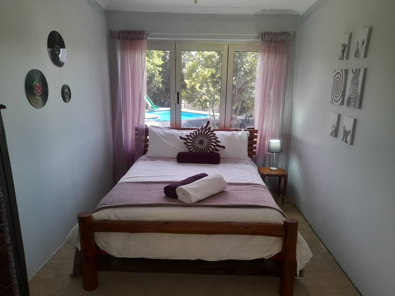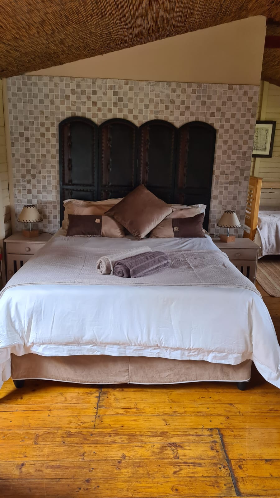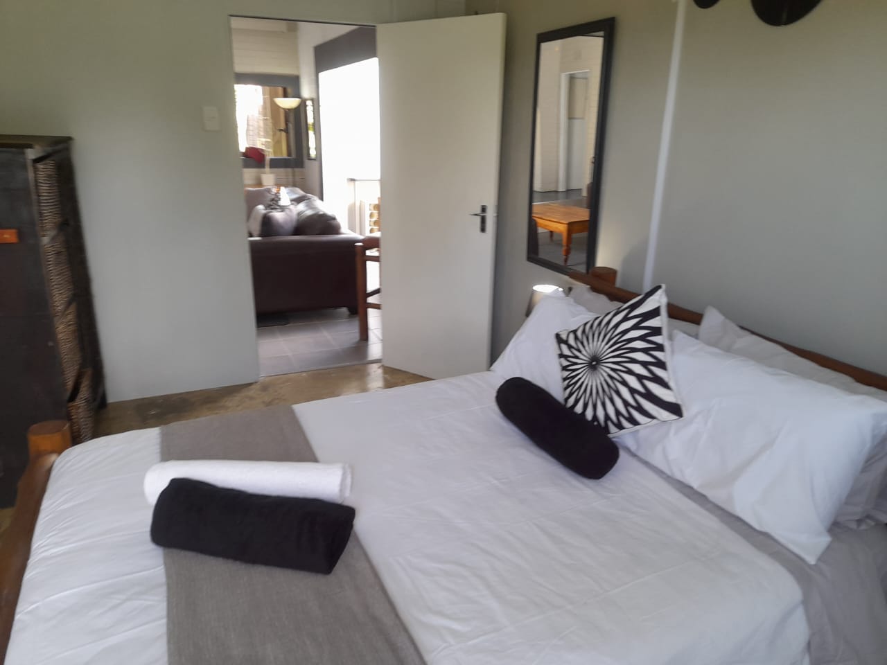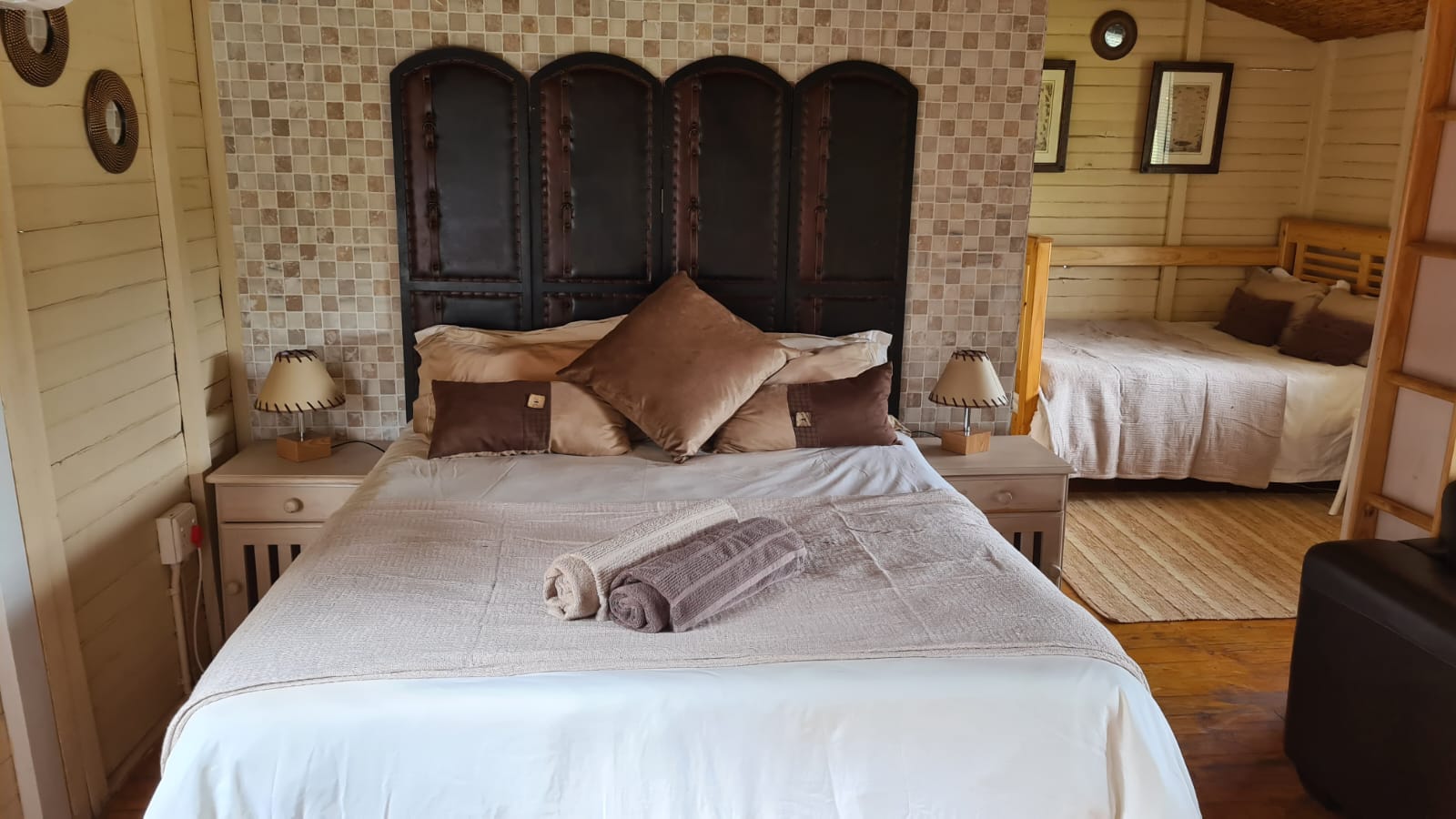 An air conditioned self-catering luxury cabin that can sleep a max of 4 adults or total of 5 persons including children under 12 years (queen bed, double bed and single bunk bed and small lounge with couch).