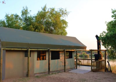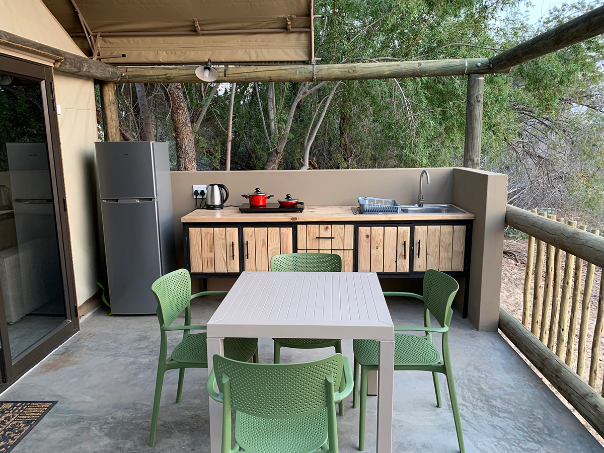 Each open-plan tent sleeps 2 - 4 guests and features two single beds, a sleeper couch, an en-suite bathroom, and a fully equipped outdoor kitchenette. A private patio with a braai and stunning river views completes the experience.