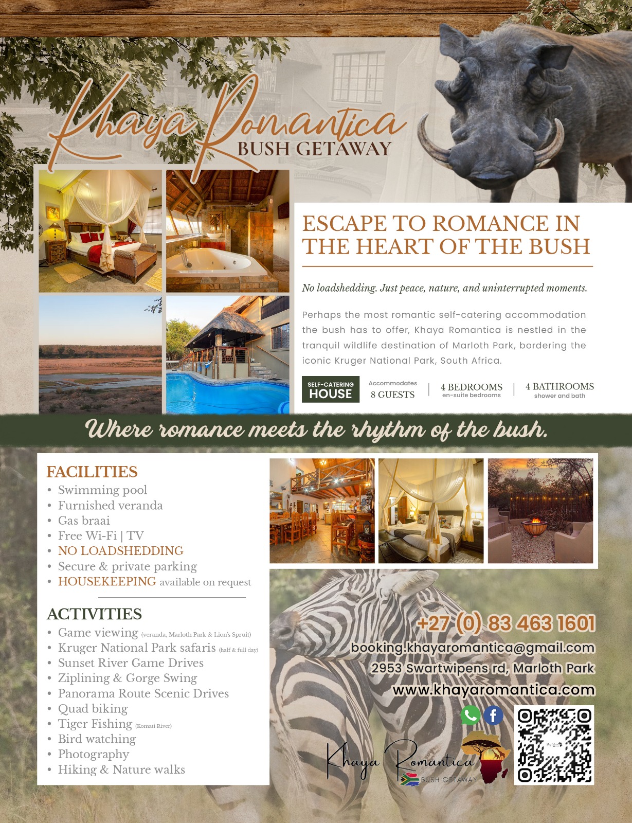 Perhaps the most romantic Self -catering accommodation the bush has to offer, Khaya Romantica is situated in the tranquil wildlife destination of Marloth Park, boardring the Kruger National Park, South Africa.