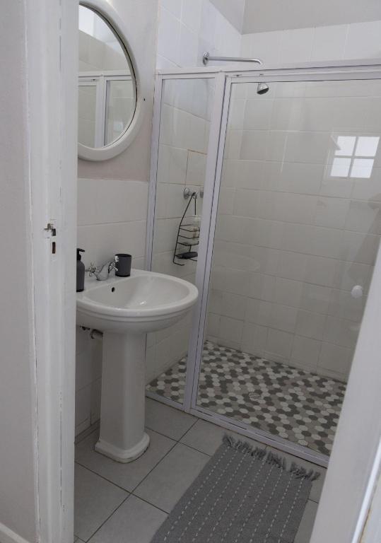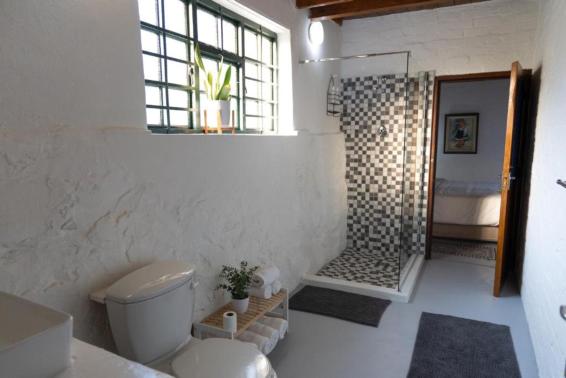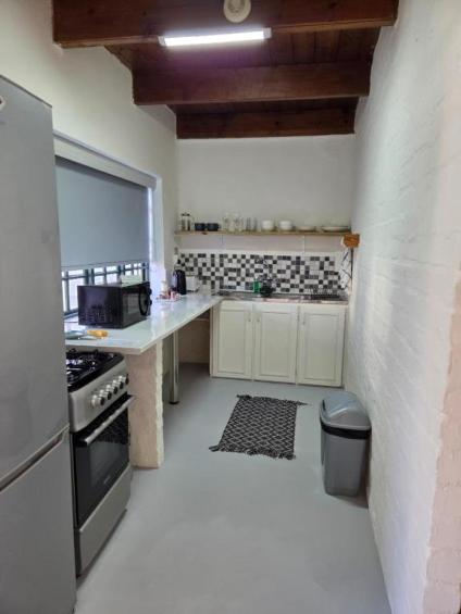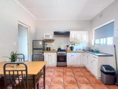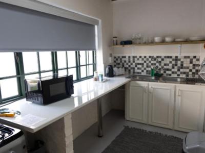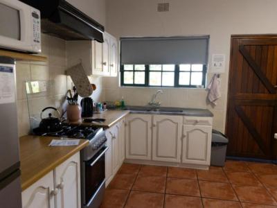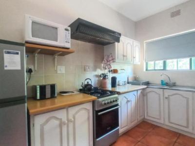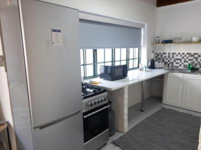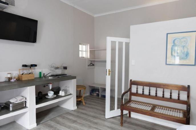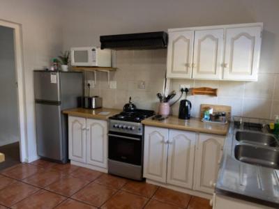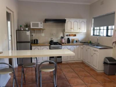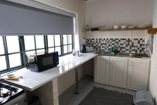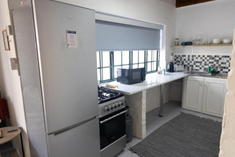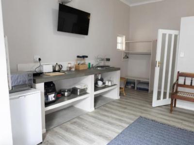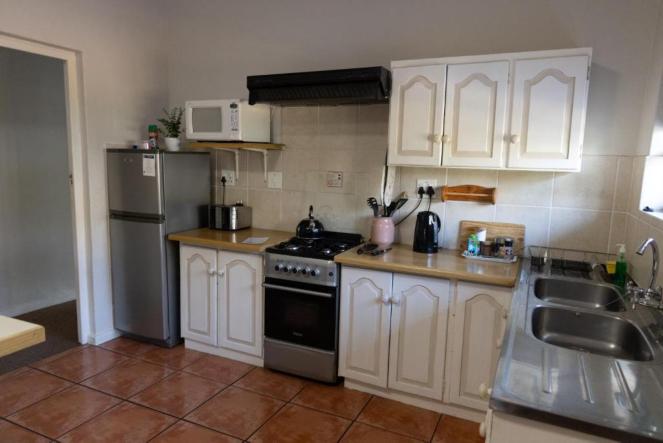 The well-equipped kitchen has an oven, stove, fridge, small freezer space, microwave, toaster, and kettle, and the lounge area has a TV with a full guesthouse selection of DStv channels.