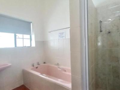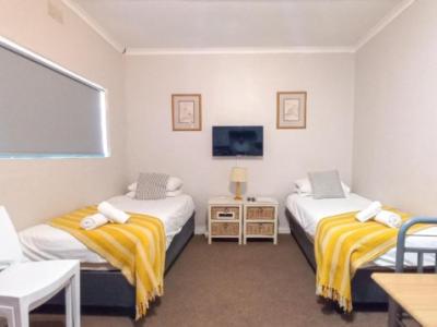 The self-catering apartment comprises 1 bedroom with a queen-size bed, a single bed, as well as 2 single beds in the open-plan lounge, and its en suite bathroom is fitted with a bath and a separate shower cubicle.