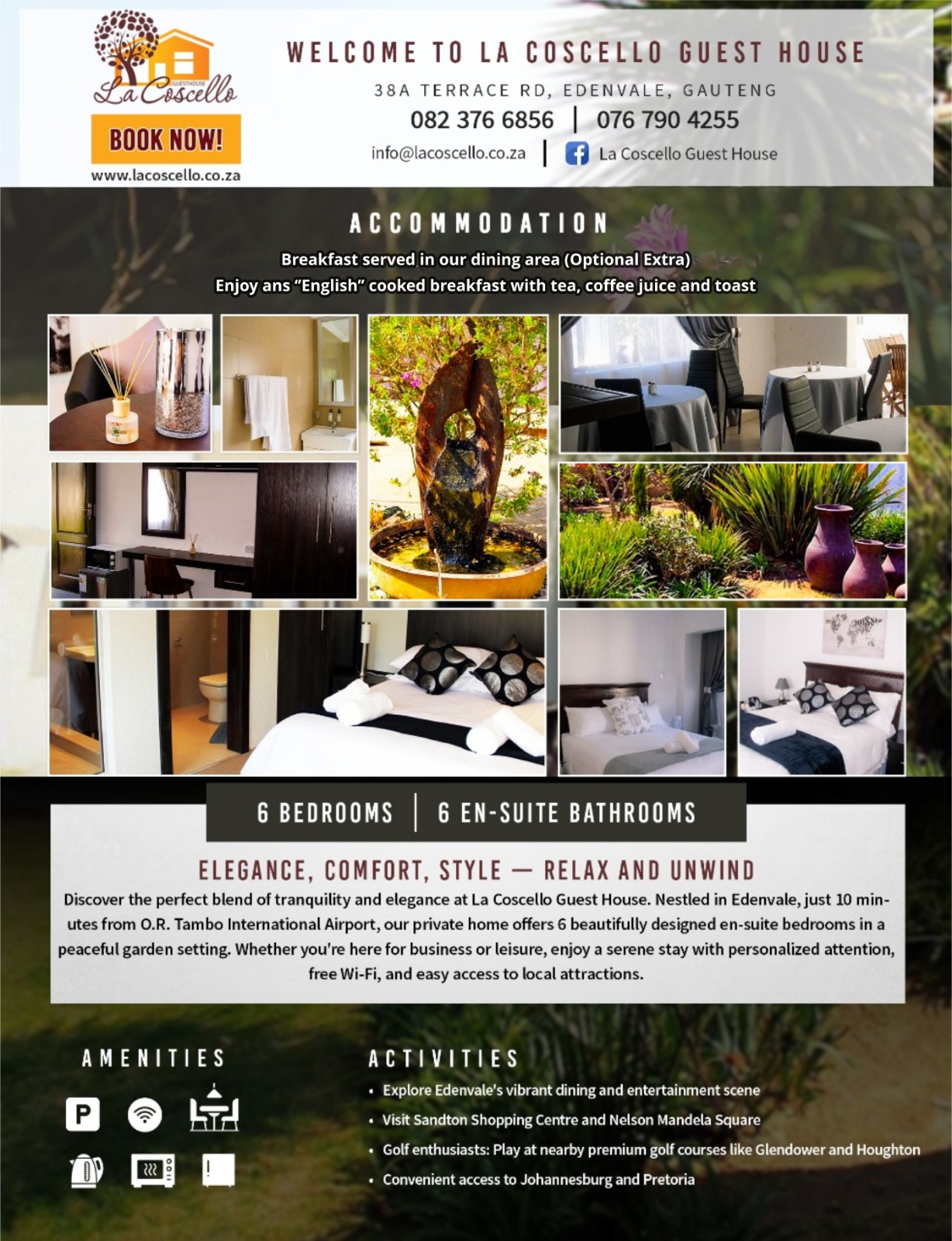 If you are here on business, conference or training; what better place to stay? Experience the peace and quiet, personal touches, free Wi-Fi and easy access to all of the major business centre's in and around Johannesburg.