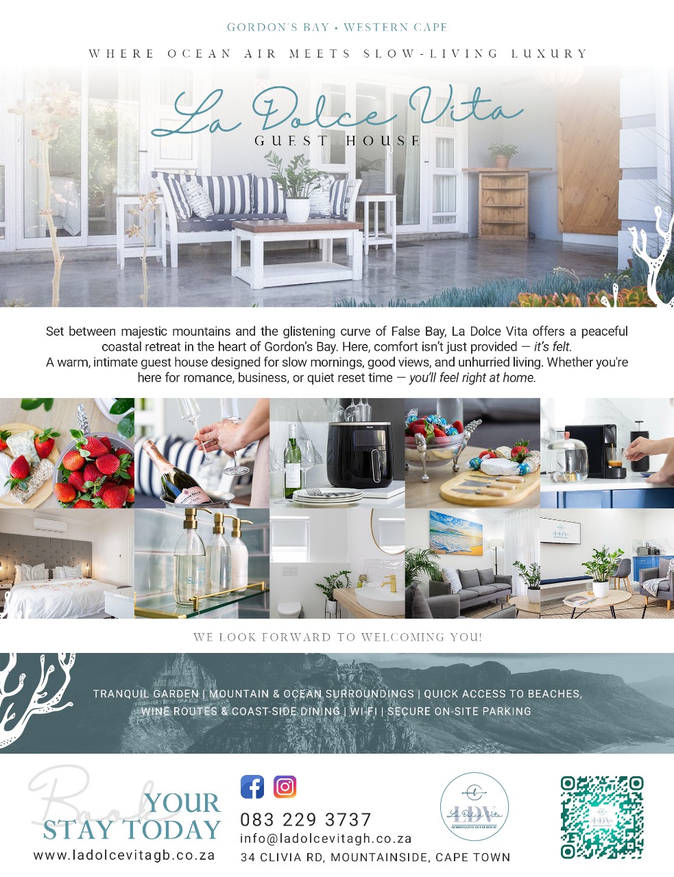 Nestled in the picturesque town of Gordon's Bay, La Dolce Vita Guest House offers a tranquil retreat amidst the majestic mountains and glistening ocean. Our guest house is dedicated to providing luxurious accommodation and genuine hospitality, ensuring an unforgettable escape along the stunning Western Cape coastline.