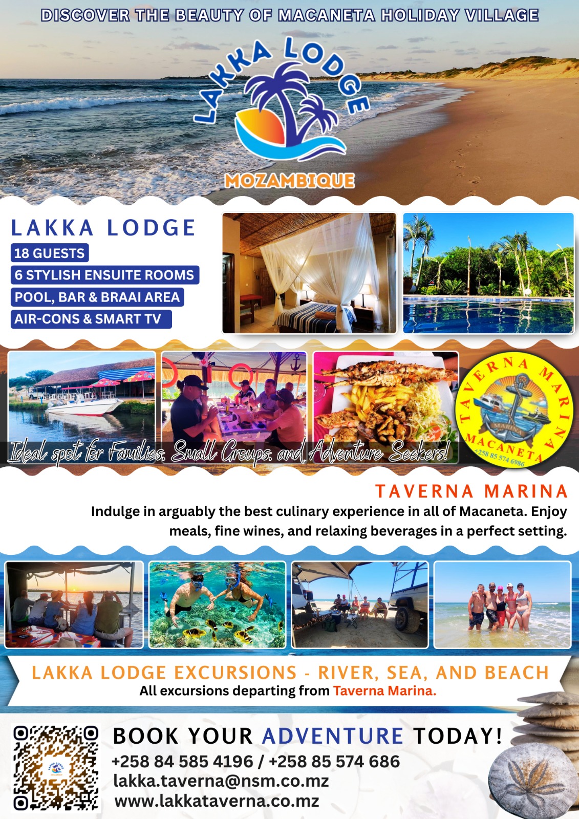 LAKKA LODGE & Excursions, MACANETA is the ideal, smart small retreat for families, small corporates or FIT’s & accommodates up to 18 guests, in 6 rooms. LAKKA LODGE is designed and presented in fine style, comfort & the most intriguing contemporary atmosphere imaginable. You will feel treated all the time like a real holiday guest as our ambience constantly reminds our guests of the perfect balance we created with our contemporary unique luxury - especially for you, friends and family. Relax and rejuvenate at Lakka Lodge, whilst preparing for your next day to explore. We are close to all what is to see and do in Macaneta, - may it be - seeking the sun, beach fun & blue waters of the warm Indian Ocean, adventure, laughter, pub crawling & professional excursions done by us. You may choose from: 4x4 beach drives, for catered beach braais & seeking the mysterious Panzy shell @ Panzy island, or cross the Maputo bay in our boat to go snorkeling at Santa Maria’s splendid snorkeling reserve & visit the rest of Inhaca island or also deep sea fishing. On return drive by scarce and resident bird colonies like flamingos, pelicans, broad billed storks and more. Even opt for a divine Nkomati-river birding & sunset cruise with us - So divine you will think you are on the Okavango river – picture & sole perfect - totally rewarding.