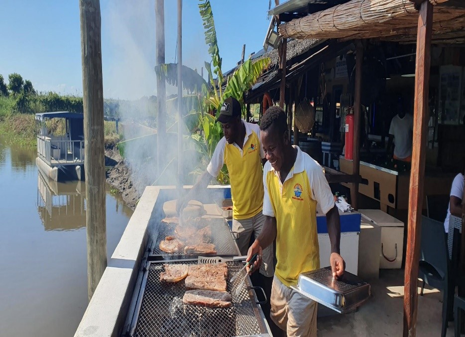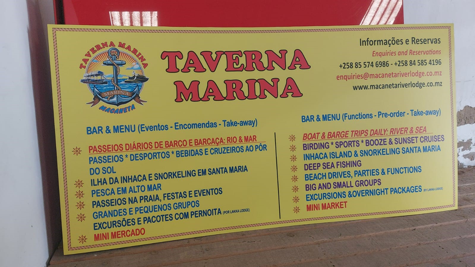 Arguably the best restaurant in MACANETA: TAVERNA MARINA (bar & excursions) - Right on the banks of the Komati River in the paved main road of MACANETA. The cuisine and well-designed layout of our menu will impress, but as the saying goes - "the proof of our dishes are in the eating!!". With perfect Mozambican / Southern African & international travelers selected cuisine, TAVERNA MARINA is more than just a dining destination; it’s thee smart social hub in MACANETA, an embarking and disembarking point for all our boat and beach excursions. (See end of document.) Safe parking is available on entry, right next to the entrance.
