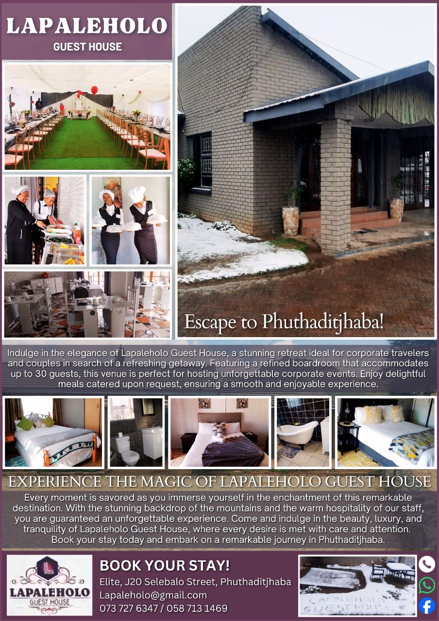 Welcome to Lapaleholo Guest House, your cherished home away from home in the captivating town of Phuthaditjhaba, nestled in the picturesque Free State province of South Africa. Surrounded by the majestic Drakensberg Mountains and enchanting Maluti Mountains, Phuthaditjhaba is a true gem waiting to be explored, especially when it is snowing! – Lapaleholo Guest House is your perfect haven in this breathtaking setting.