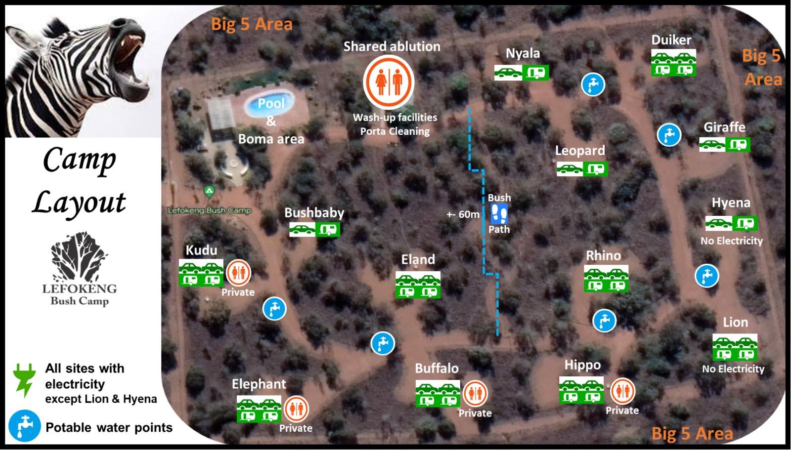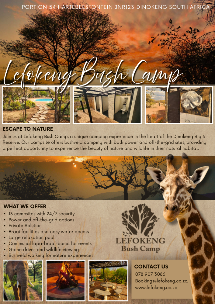Welcome to Lefokeng Bush Camp, a unique camping experience situated in the heart of the Dinokeng Big 5 Reserve.