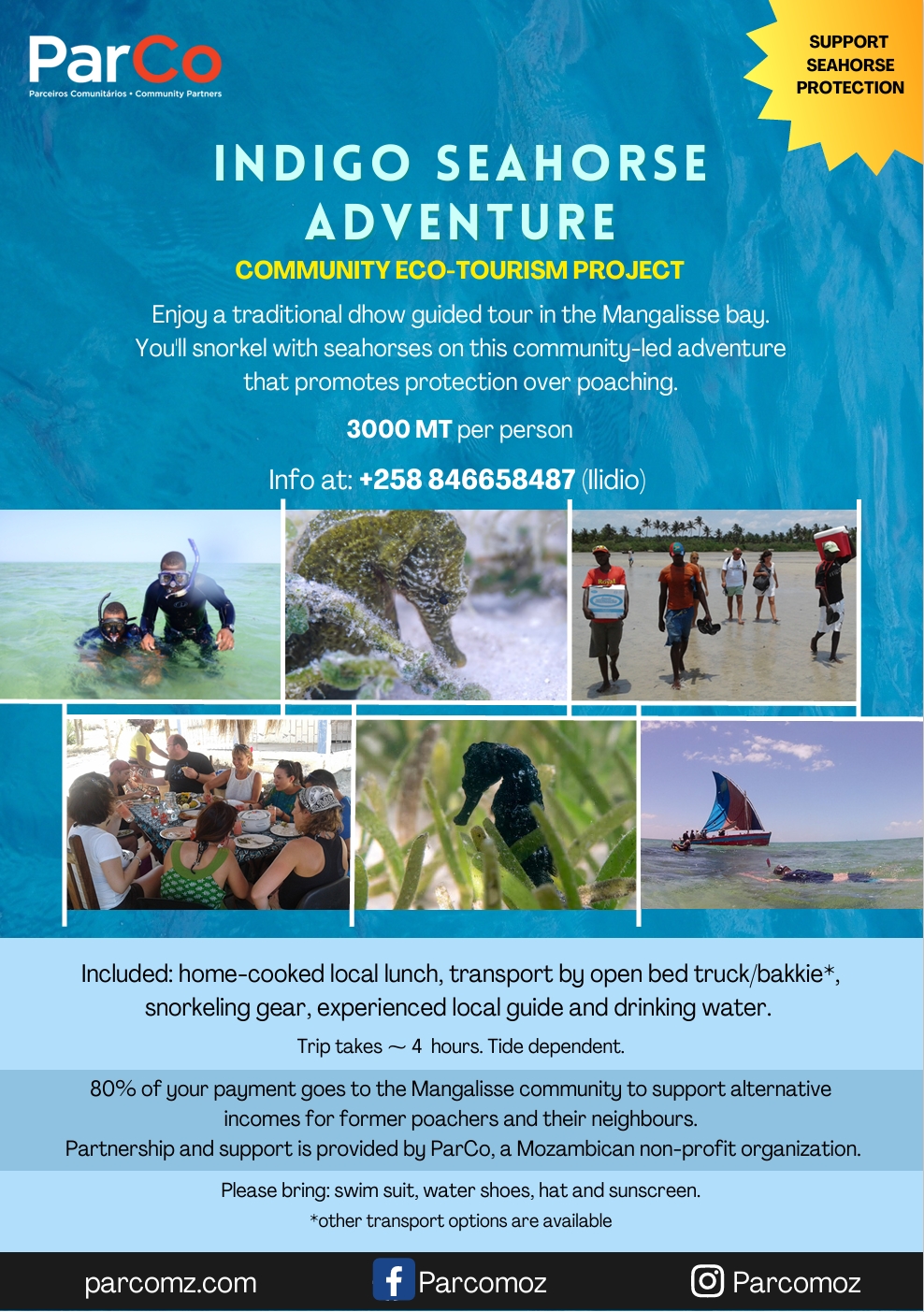 Sea horse safari 55$ per person includes: a trip to the sea horse reef, snorkeling equipment, snacks and water.