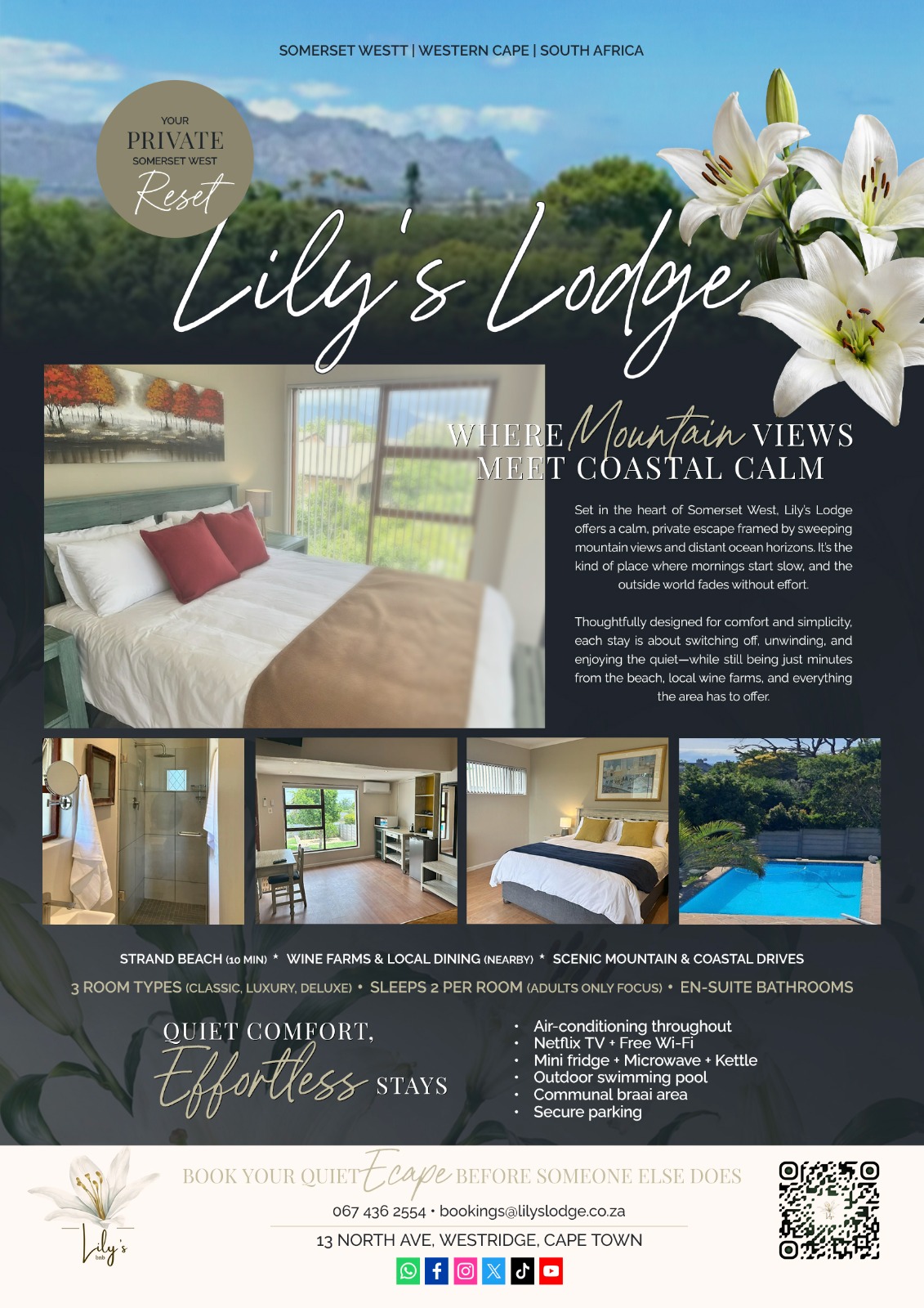 Lily's Lodge is nestled in the heart of Somerset West, offering breathtaking views of the mountains and the sea. Our lodge provides an idyllic escape for those seeking peace and relaxation. With thoughtfully designed accommodations and exceptional amenities, we strive to make your stay unforgettable.