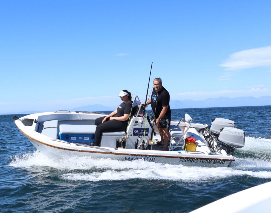 Passion drives us at Mad Mahi Marine. Businessman and avid fishing enthusiast Gareth Decker’s love for the ocean started young, fishing with his dad and uncles in Kei Mouth. With over 40 years of skippering experience, Gareth brings intimate knowledge of the False Bay coastline and sea to every adventure. His dedication to sharing the ocean’s wonders blends with his expertise to make every trip memorable. Gareth’s wife, Jacqui Decker – an accomplished angler herself – joins in fostering unforgettable experiences, encouraging juniors and ladies in fishing, and holding records in her own right.